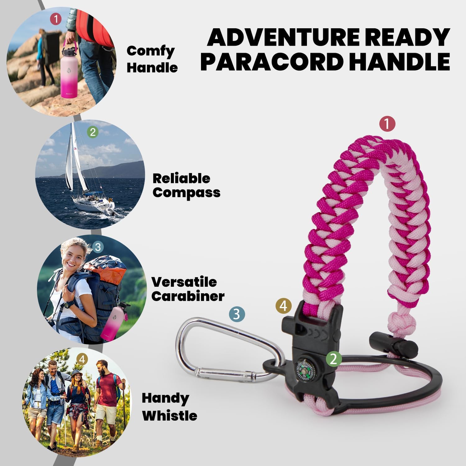- Iconic Paracord Handle: This insulated water bottle comes with a beautiful hand knit nylon paracord in coordinated color with the water bottle. Configured with a compass and carabiner, this paracord handle is a must-have as a full functional camping / hiking flask