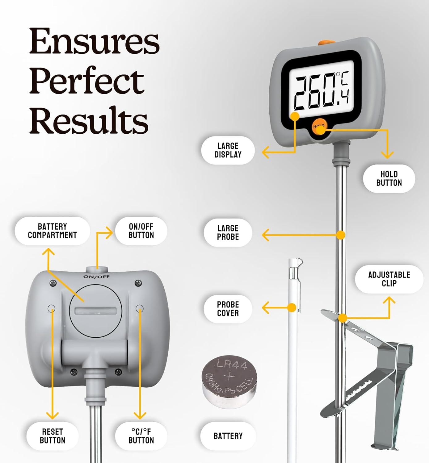 - Digital LCD Display for Easy Reading: Still using inaccurate analog thermometers? This deep fry thermometer shows precise temperature readings in clear, legible digits using its large LCD display