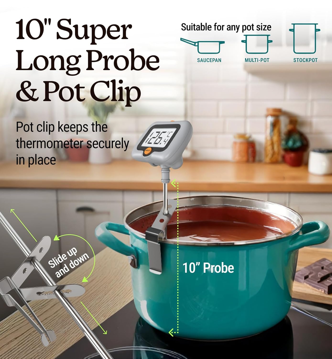 Digital Candy Thermometer with Pot Clip, 10" Long Stainless Steel Probe, Instant Read Kitchen Thermometer for Cooking, Baking, and Candy Making (Gray)