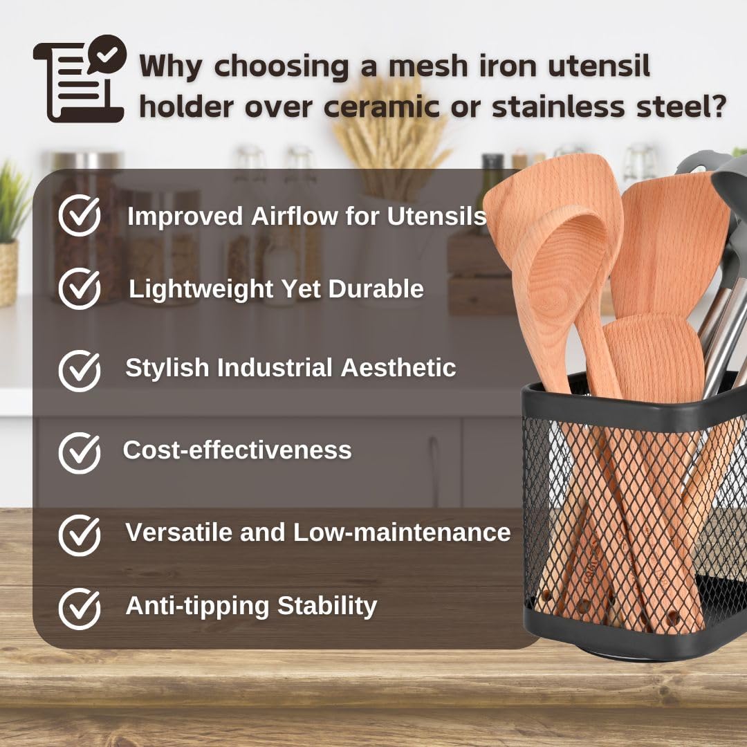 - Premium Kitchen Utensil Holder: Crafted from durable iron mesh with a sleek finish, this holder for kitchen utensils adds modern style while securely holding spatulas, spoons, whisks, and tongs on your counter.