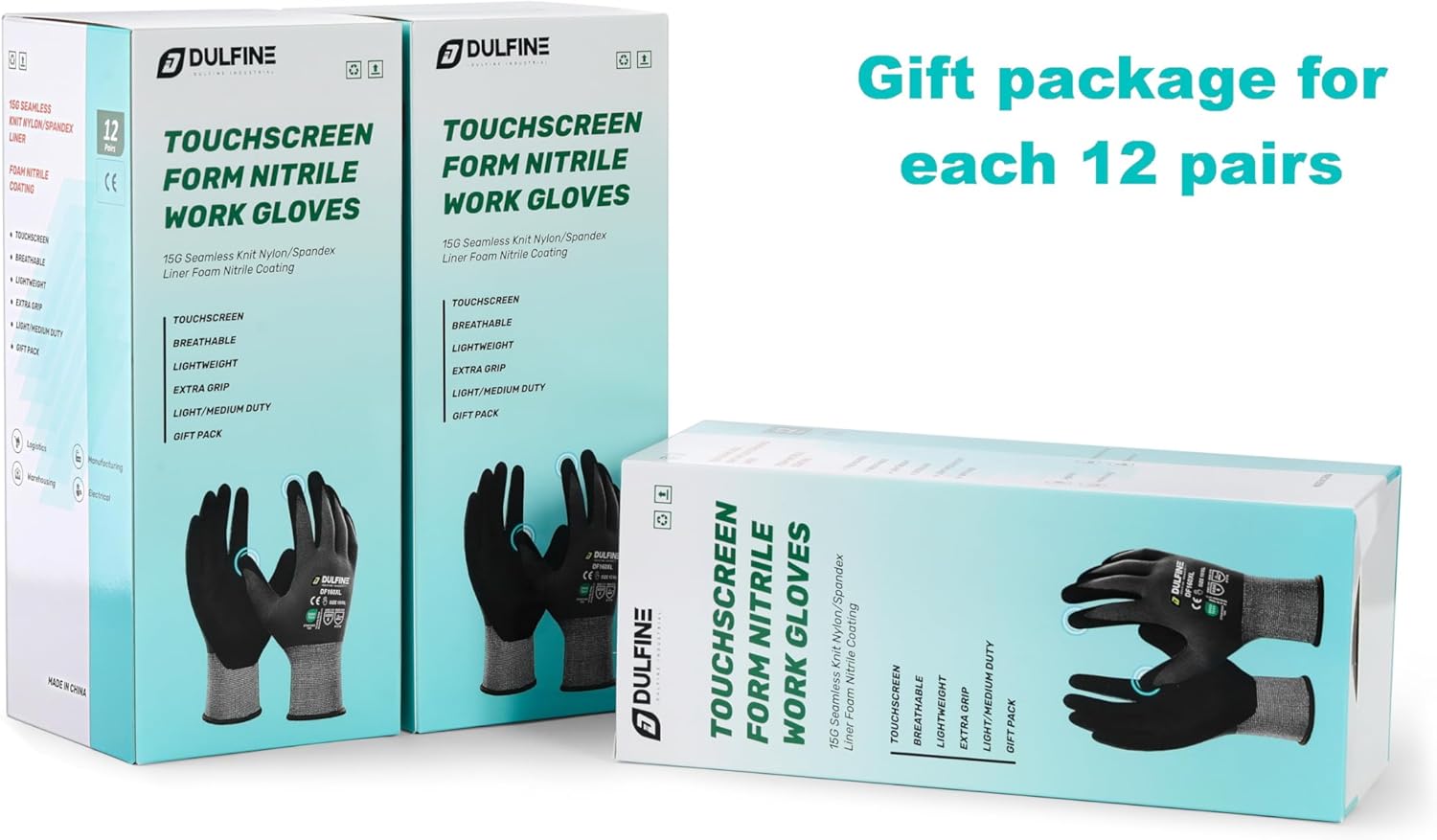 DULFINE Work Gloves for Men and Women,Hi-Vis Yellow Knit Nylon Glove with MicroFoam Nitrile Coated-12 Pairs Pack,Ideal for General Purpose,Automotive,Home Improvement,Painting(Medium)