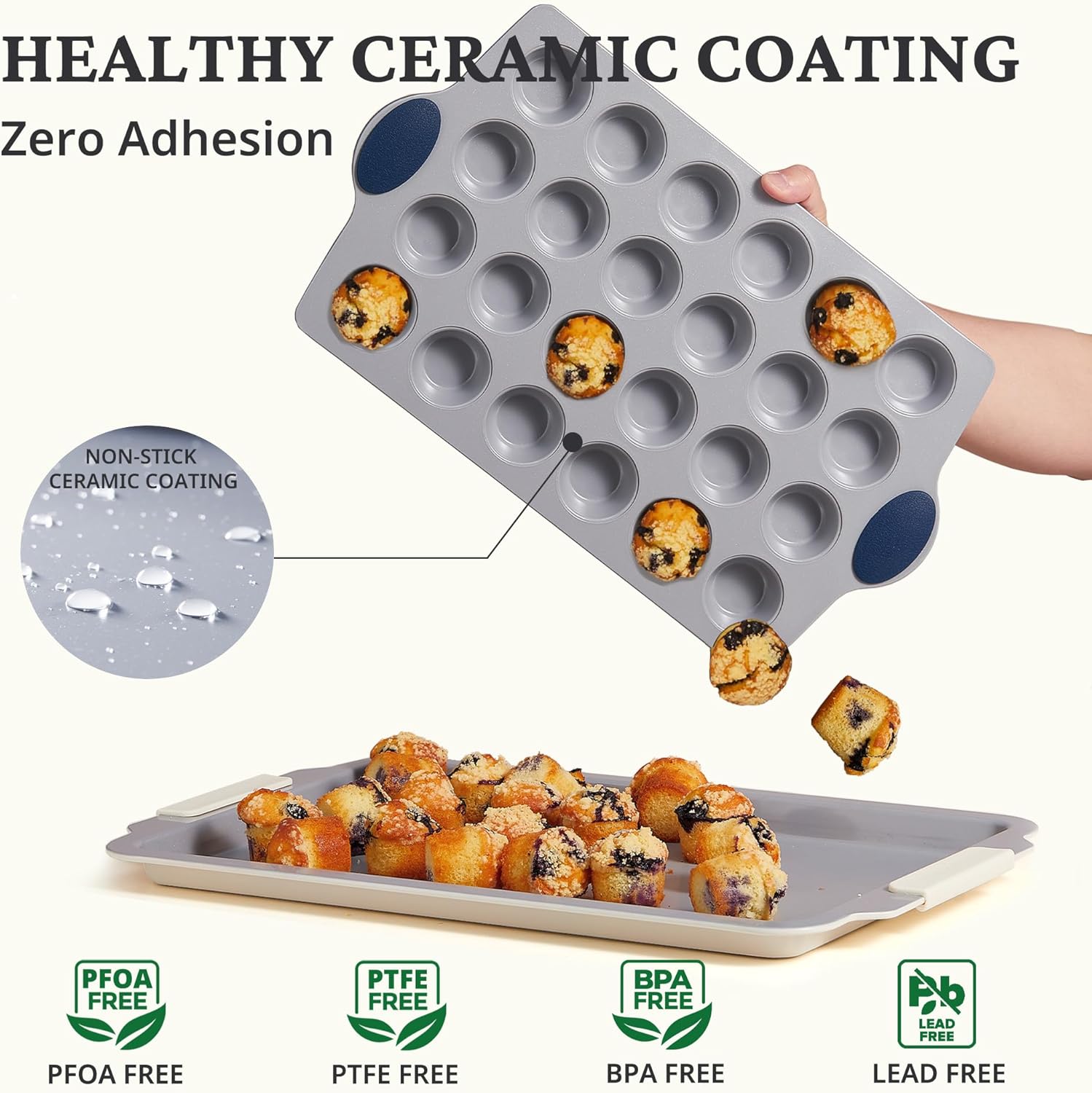 - Non-Stick Performance : Our ceramic mini cupcake pan innovative ceramic surface ensures your baked goods slide out effortlessly. Say goodbye to sticky messes and laborious scrubbing—cleanup is a breeze. Plus, the design reduces water and detergent usage, lowers carbon emissions, and saves you both time and effort.