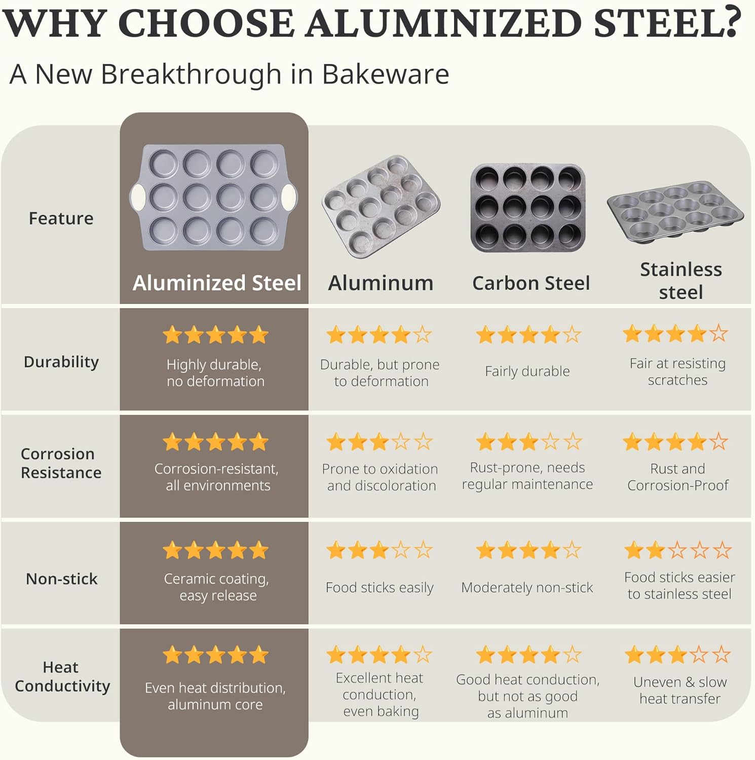 - Heavy-Duty Aluminized Steel : Our ceramic cupcake pans are crafted from high-quality aluminized steel, a new and advanced material offering 50% better corrosion resistance and durability compared to traditional pans. This innovative material provides even heat distribution, significantly reducing baking time and withstanding temperatures up to 500°F. Ideal for ovens, dishwashers, refrigerators, this muffin pan is designed to enhance convenience in every kitchen.