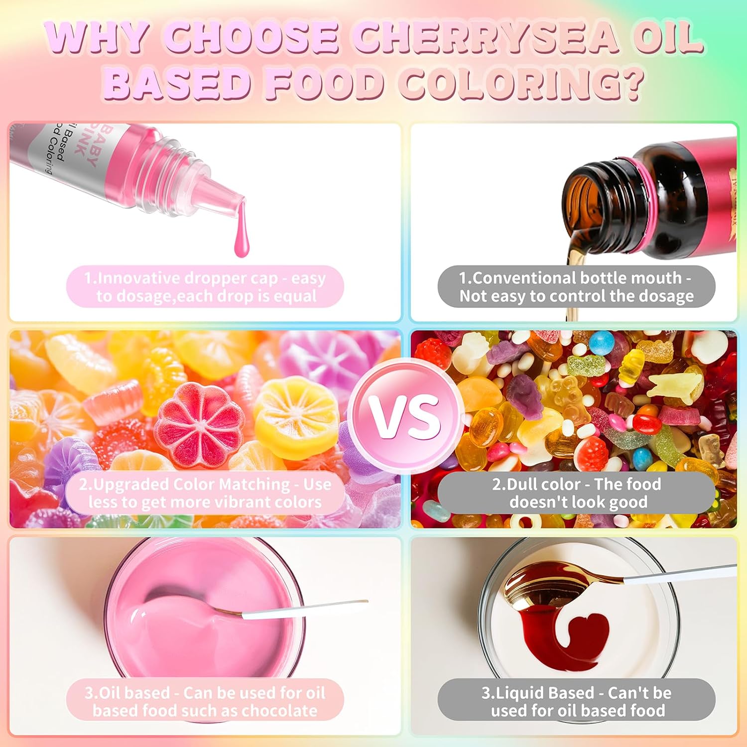 - Best Oil Based Baking Food Coloring Set - Different from water-soluble and gel based food dye, this oil-based based is specially designed for chocolate, butter, mousse, and candy.