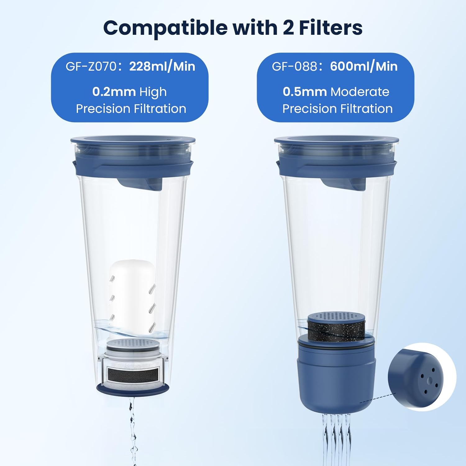 - Two Filtration Options: We provide two distinct filter to meet specific needs. For those seeking speed and enjoy refreshing water without delay, our activated carbon filtration (GF-088) is designed for a high flow rate. If you prioritize exceptional filtration, our ultrafiltration option (GF-Z070) offers a precision of 0.2 microns, ensuring that your water is not only clean but also free from impurities that can affect taste. Simply search 'GF-088' for our fast-flow solution or 'GF-Z070' for our high-precision filtration
