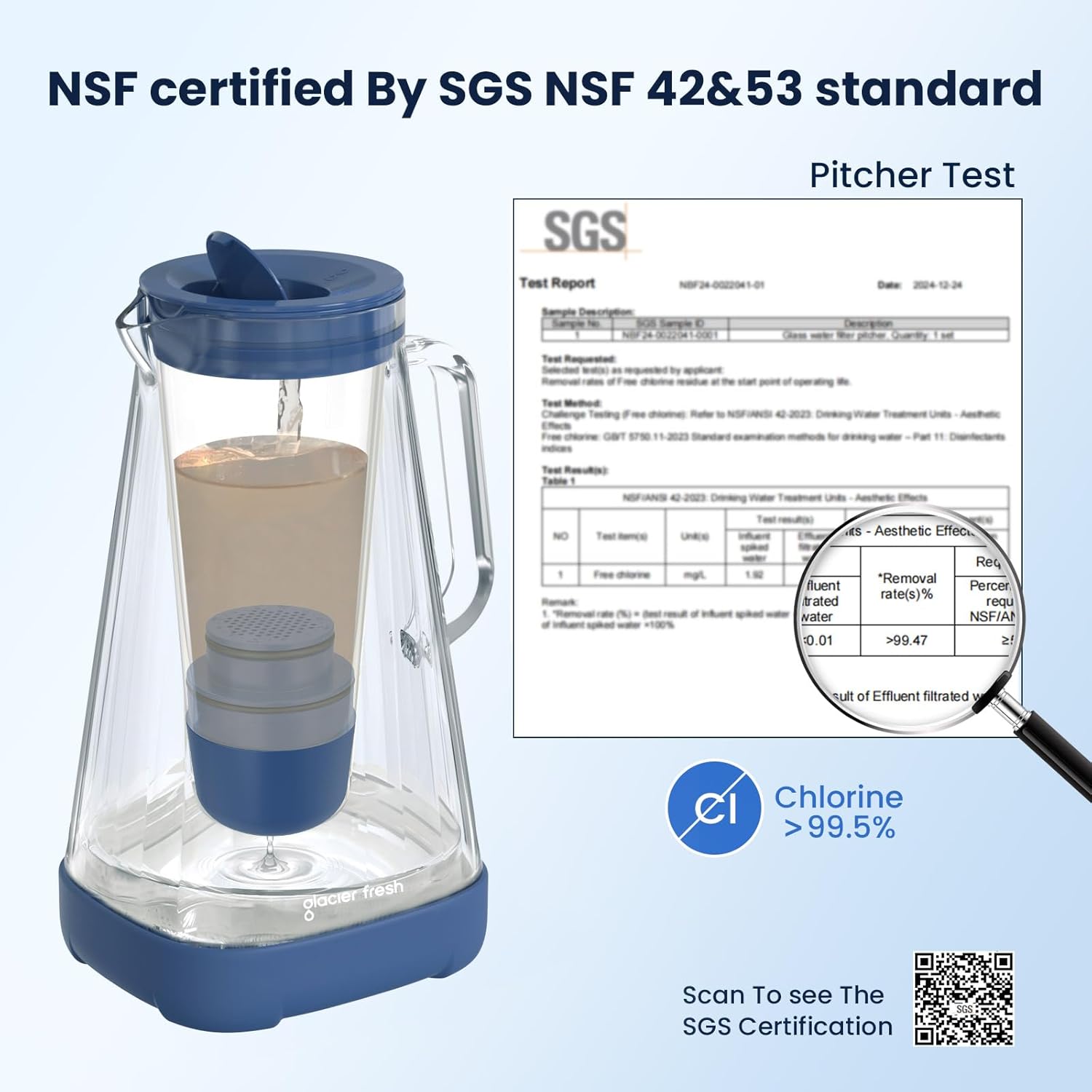 - Excellent 5-Stage filtration: This purela glass water filtration pitcher utilizes a comprehensive 5-stage filtration process that can effectively minimize the presence of 99% chlorine, taste&odor, sand, sediment and large particles.Our filtered water pitcher ensures that every sip is pure and revitalizing for you and your loved ones. To ensure you have great-tasting water, GLACIER FRESH recommend you change glass water purifier every 2 months or 40 gallons