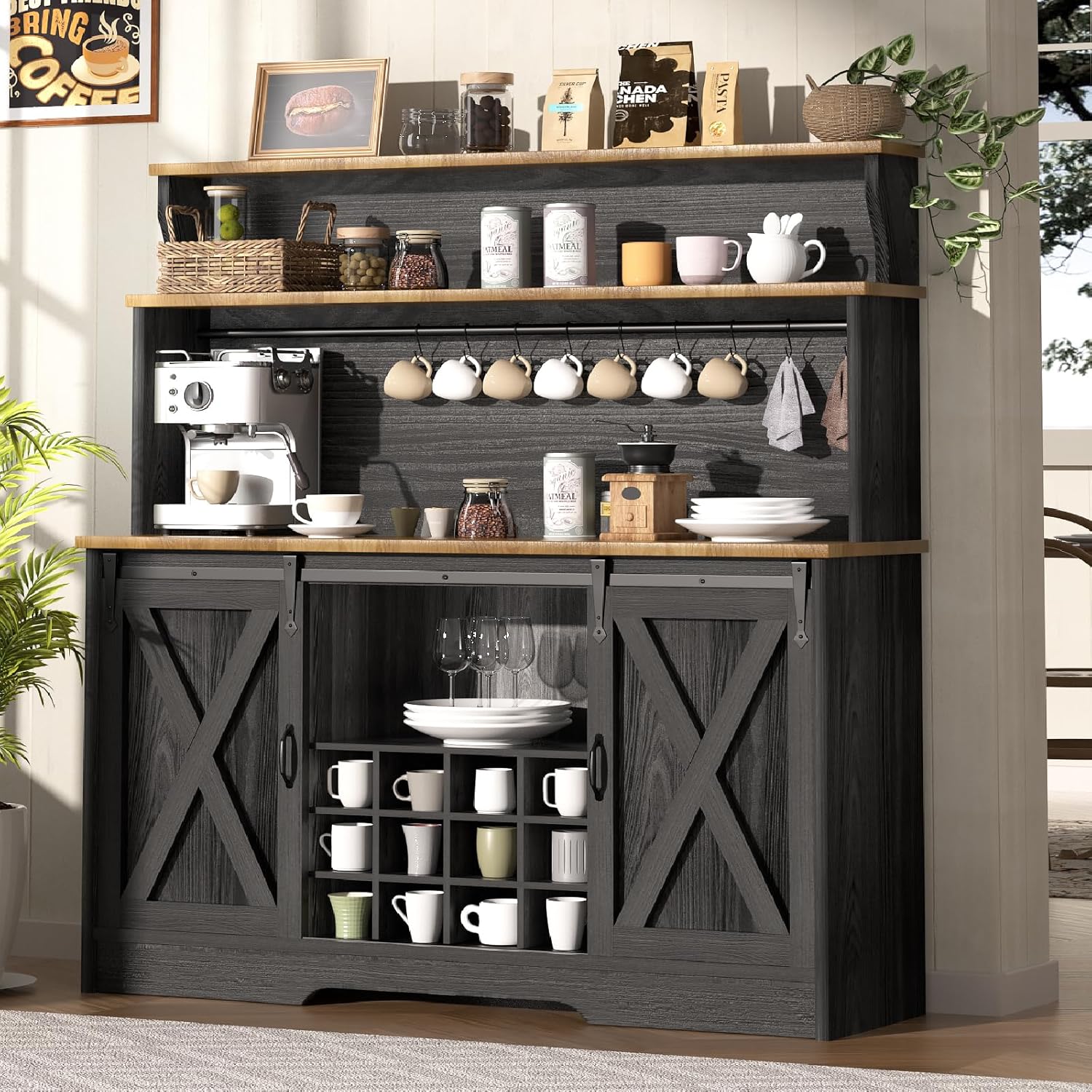 - [Easy to Assemble&Clean]: Assembly is quick with detailed instructions. Giving your setup a clean, organized look and the farmhouse bar cabinet with hutch is so easy to clean. This coffee bar's layout ensures everything is within easy reach.