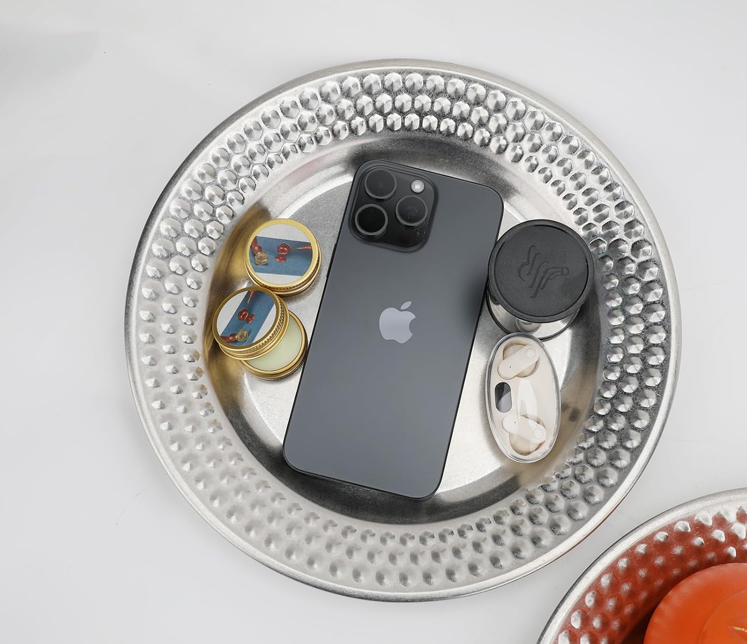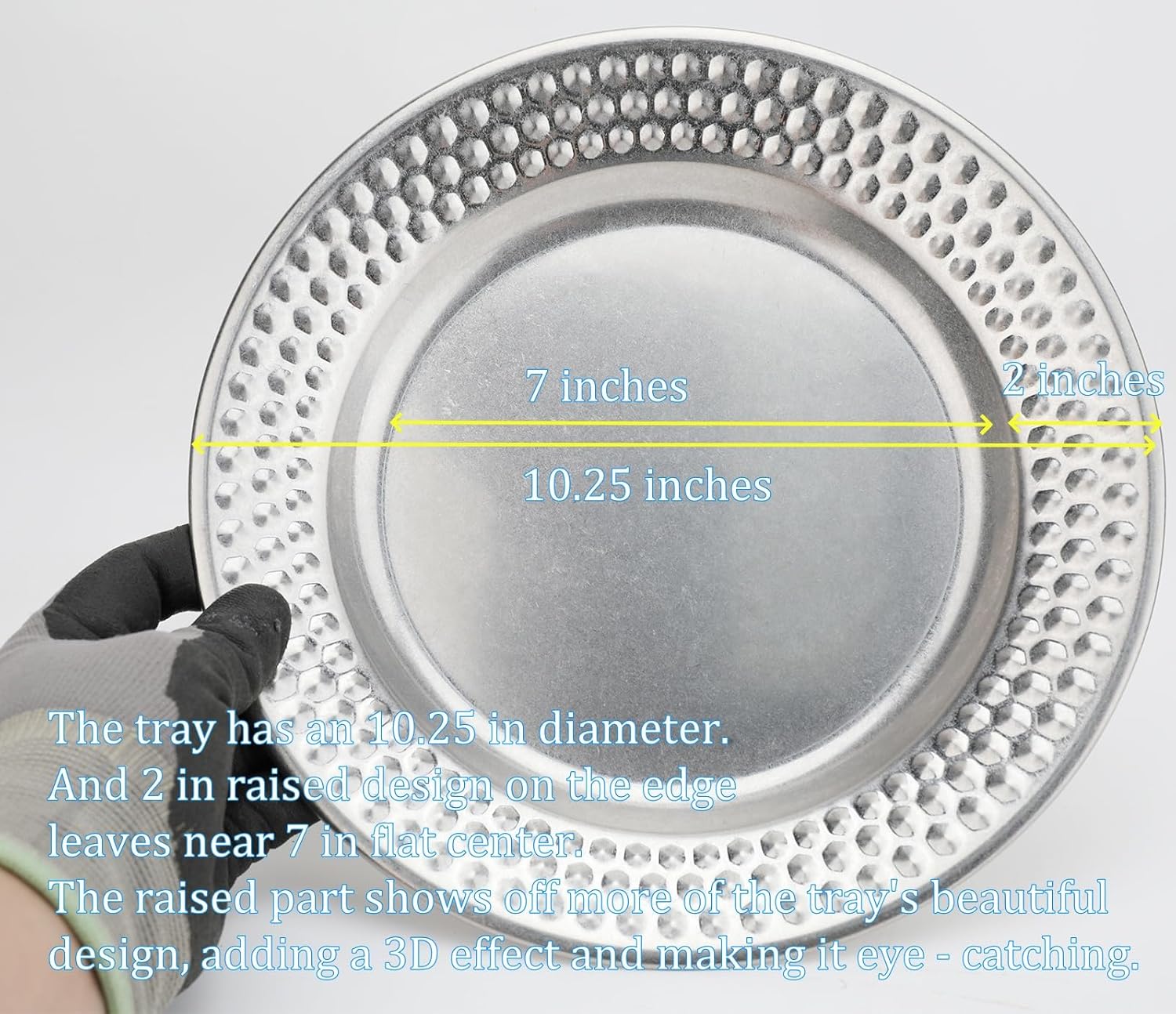 Fermus Set of 2 Round Vintage Metal Tray Diameter 10 1/4 inches, Jewelry Organizer Bathroom Clutter Rustic Decorative Trays Farmhouse Centerpiece for Coffee Table Living Room Kitchen Counter, (2 Pack)