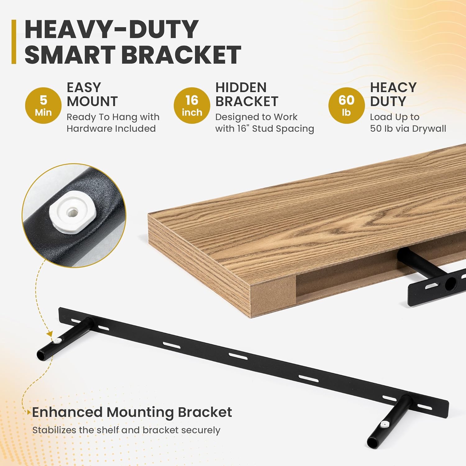 - [ROBUST & SECURE MOUNTING]: Equipped with a sturdy, hidden mounting bracket, these 36-inch floating shelves ensure solid support for your items. Designed for easy and secure installation, they come with all necessary hardware for a firm, wobble-free setup, allowing you to confidently display decor, photos, or functional items with style.