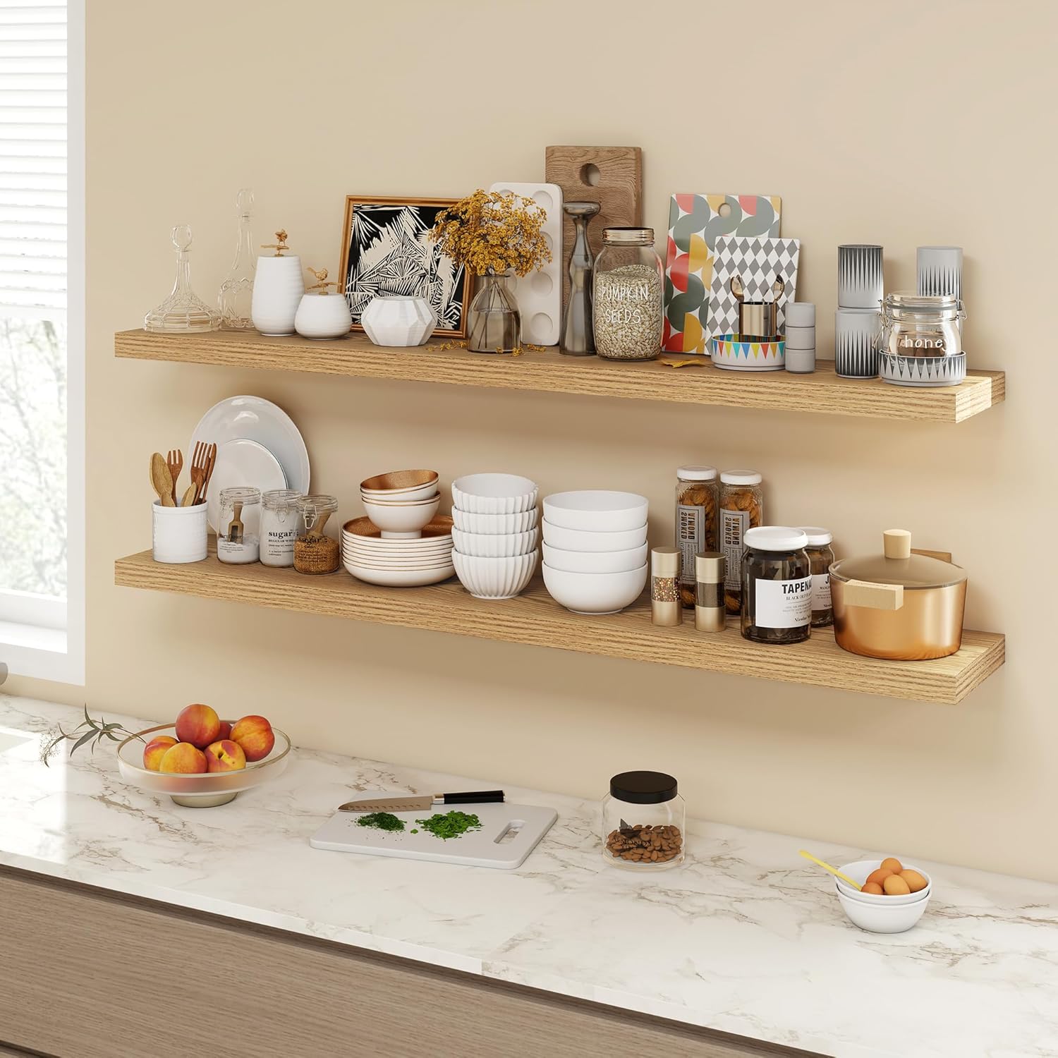 - [QUICK INSTALLATION WITH DETAILED GUIDES]: Our floating shelves include all mounting hardware and a comprehensive guide, enabling quick setup in under 10 minutes. Follow the step-by-step instructions to enjoy these beautiful shelves effortlessly, instantly upgrading your living space.
