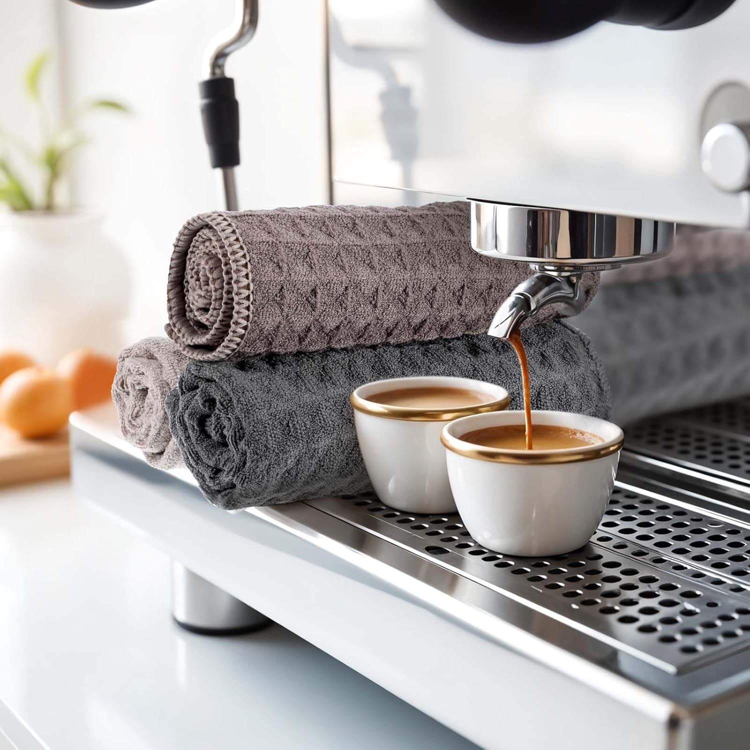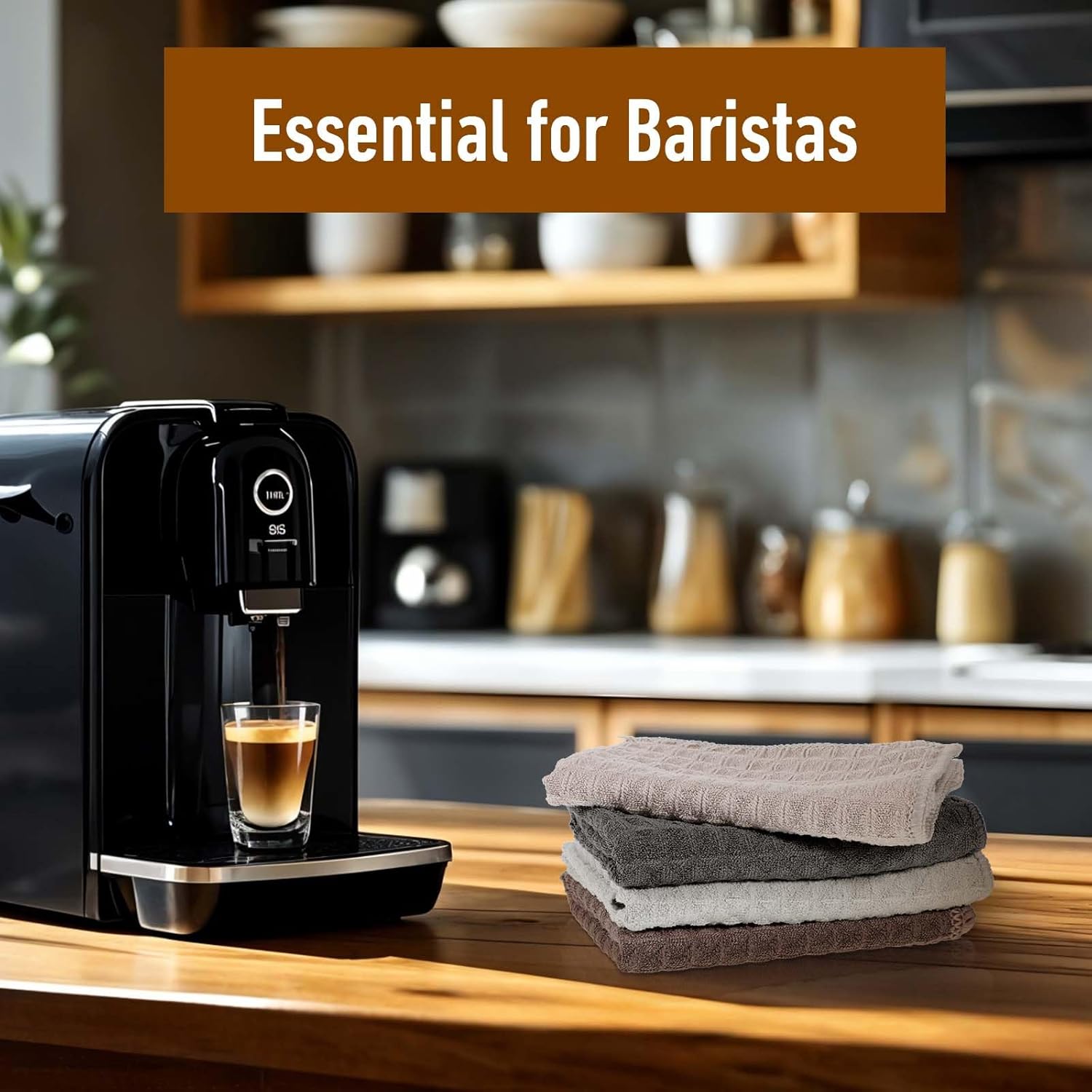 - ⭐ Complete Barista Cloth Pack: This versatile barista cloth pack includes four 12"x12" microfiber cleaning cloths, perfect for wiping coffee residue from espresso machines, steam wands, precision baskets, and countertops. Ideal for both professional and home baristas.