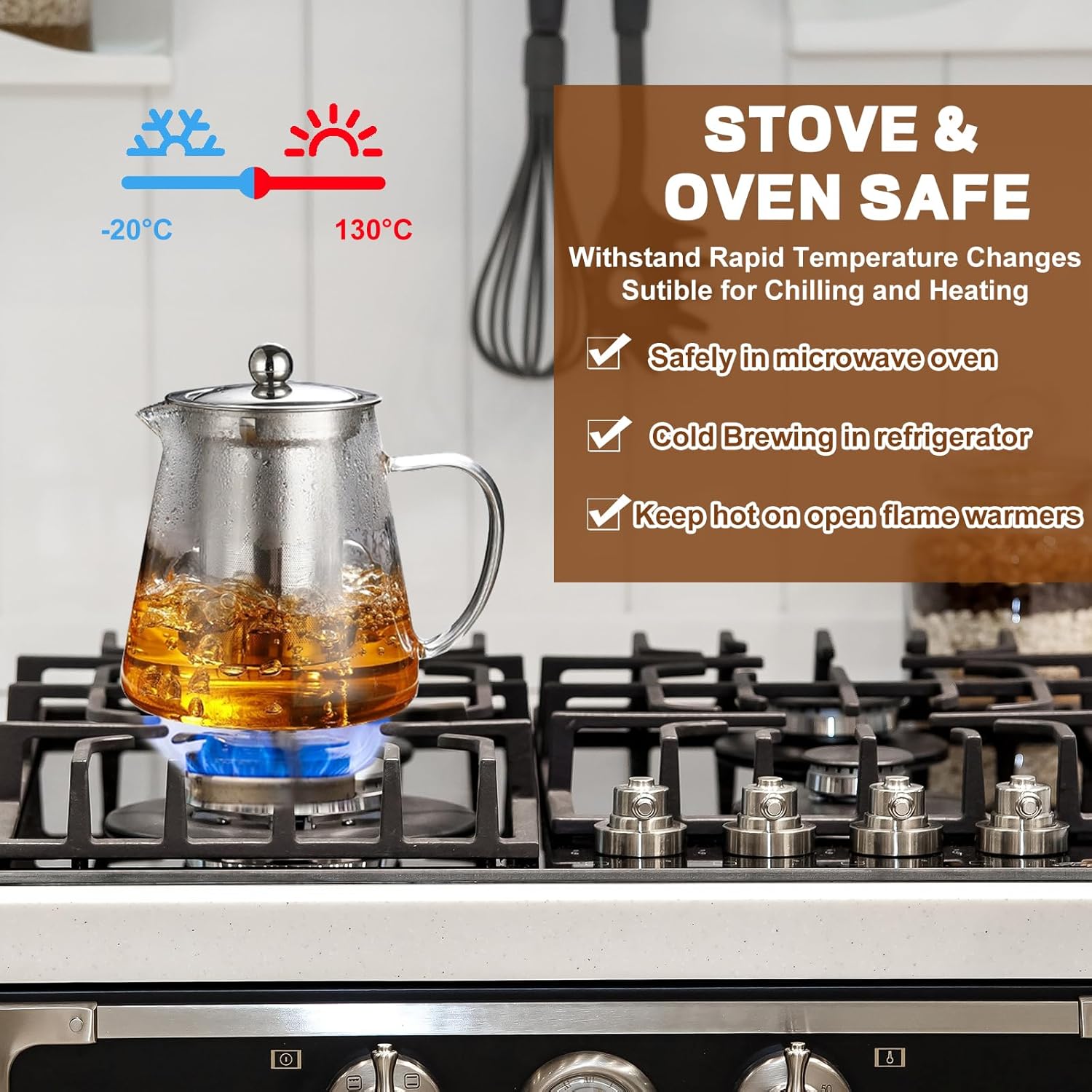 - Removable Infuser: This tea kettle has a removable infuser, which made with food grade 304 stainless steel, You can use this glass tea pot to brew loose leaf tea, tea bags, blooming camellia, fruit tea, herbal tea.