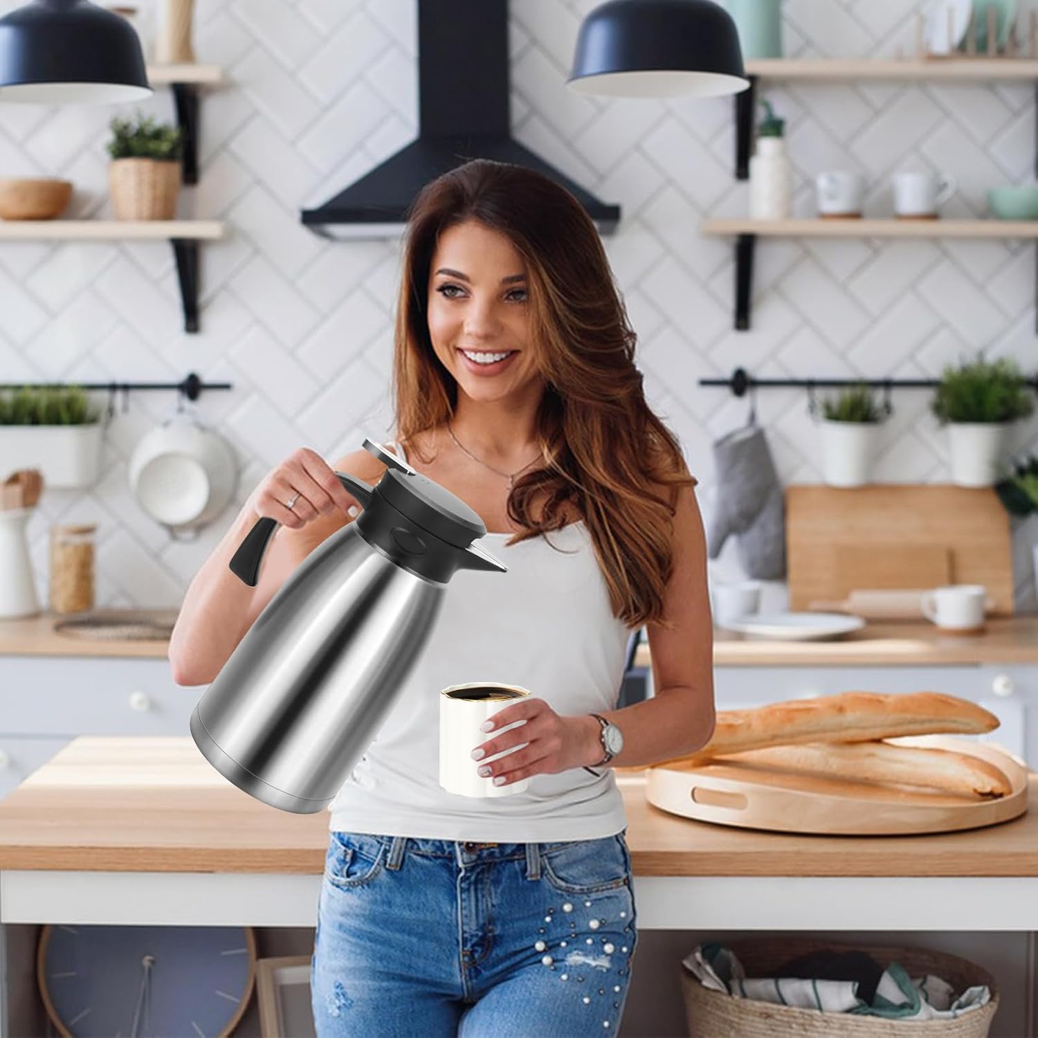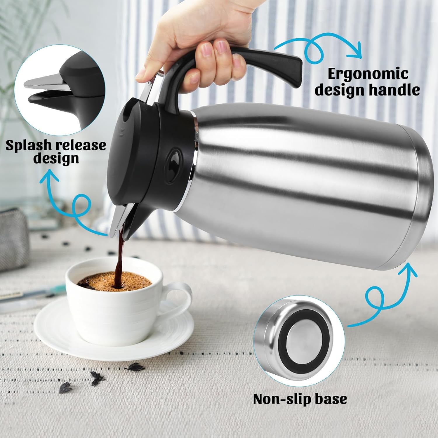 - Better Insulation: Double-layer vacuum insulation & 304 food-grade stainless steel & high-density silicone ring maximizes temperature retention; keeps thermal coffee carafe hot for up to 8 hours or cold for up to 16 hours.