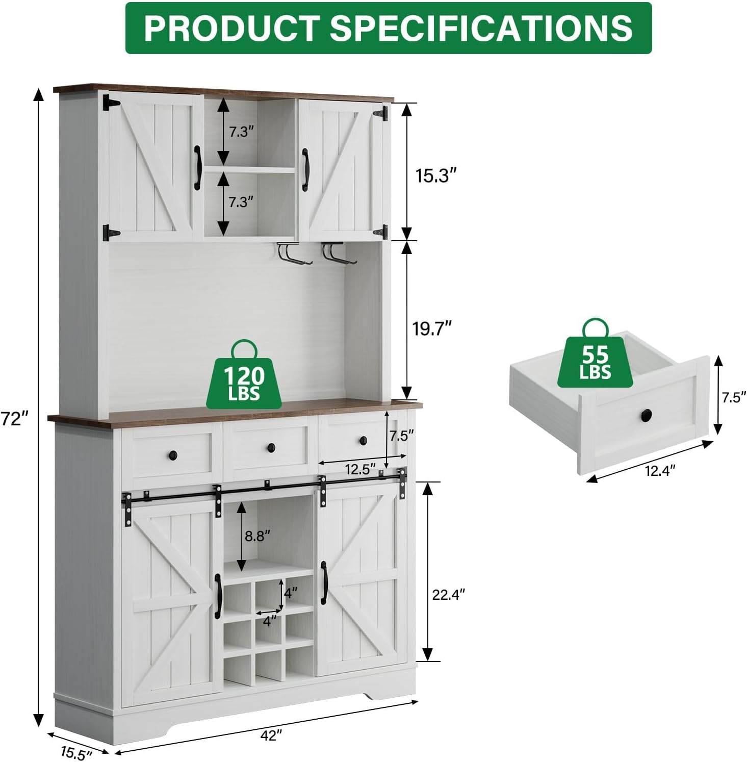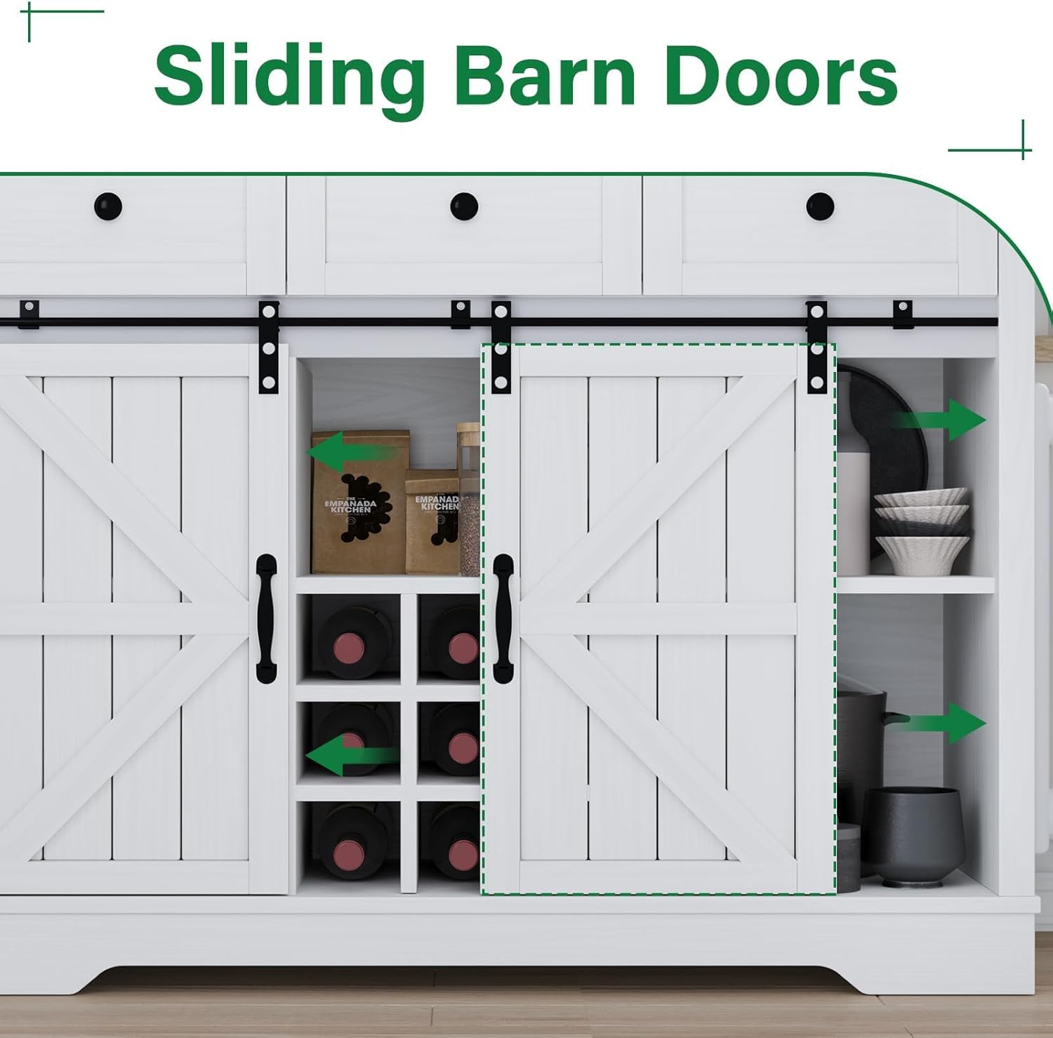 4 EVER WINNER 72" Coffee Bar Cabinet with Sliding Barn Door & Wine Racks, Hutch Cabinet with Storage and 3 Drawers, Farmhouse Coffee Bar with Wine Glass Holder for Dining Room Kitchen, White
