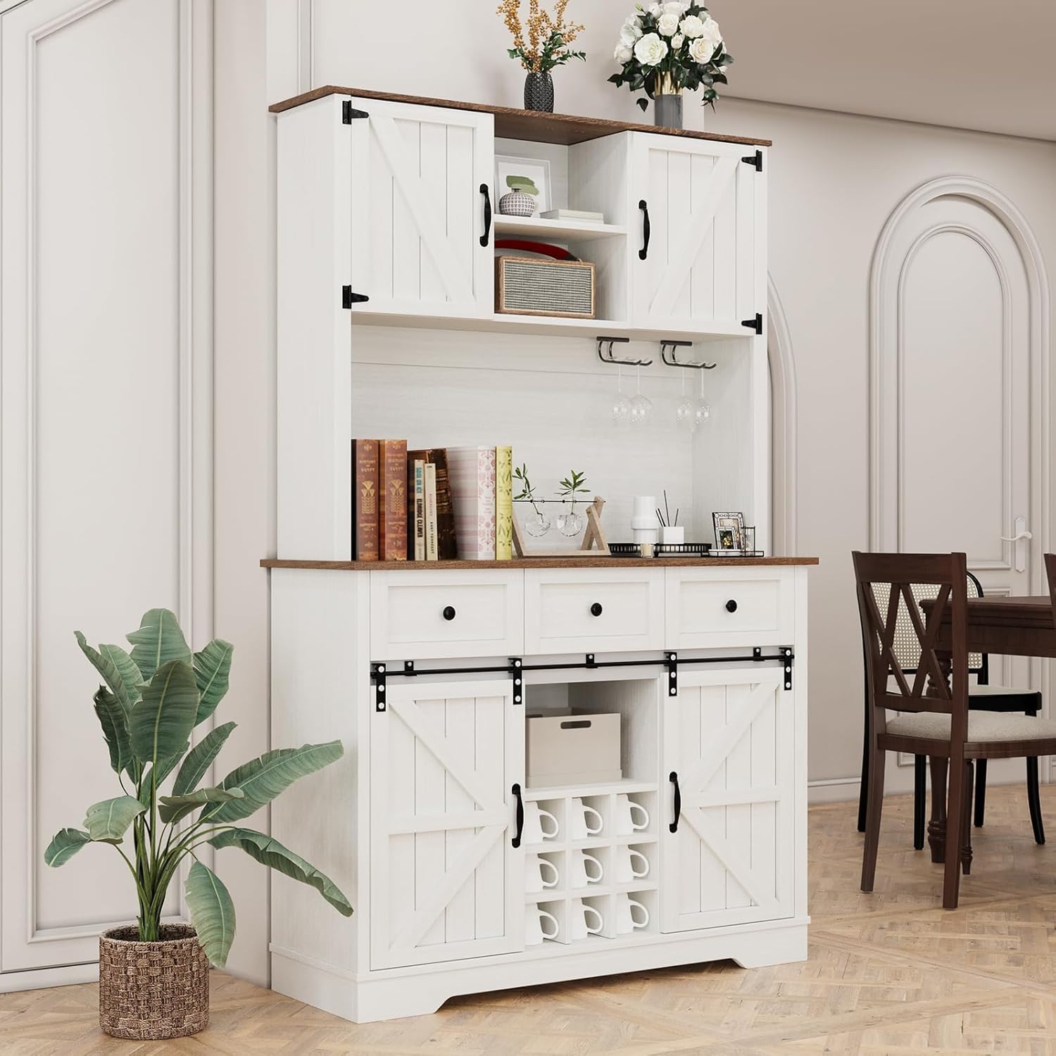 - Farmhouse Coffee Bar Cabinet: Kitchen hutch storage cabinet with 2 sliding barn doors is not only easy to access the items in the cabinet, but also adds a touch of rustic charm to the whole room, with black metal hardware to make the tall kitchen pantry cabinet more exquisite, and each cabinet has an adjustable shelf, convenient for storing items of different sizes, beautiful and functional