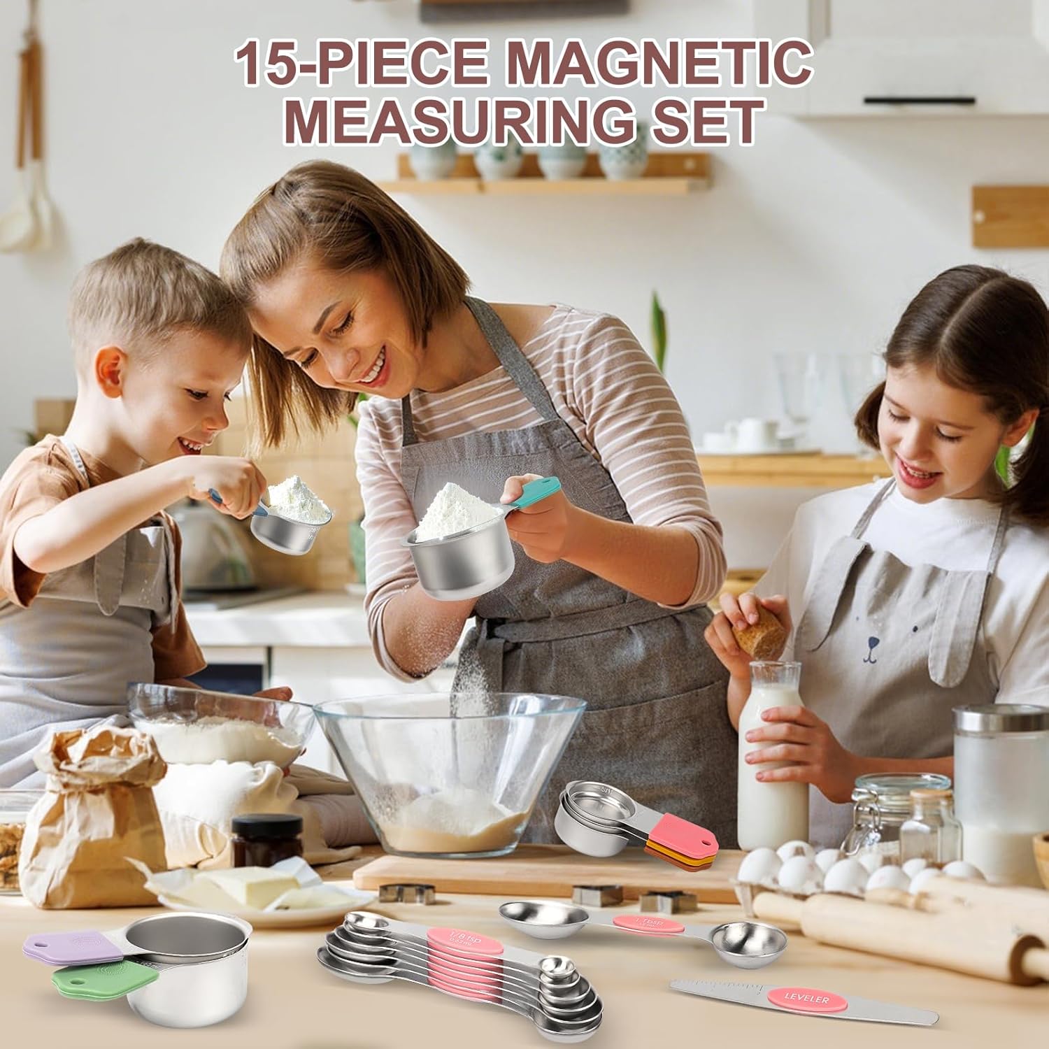 - 15-Piece Magnetic Set: Includes 7 magnetic measuring cups (1, 3/4, 2/3, 1/2, 1/3, 1/4, 1/8 cup) and 7 magnetic spoons (1 tbsp, 1/2 tbsp, 1 tsp, 3/4 tsp, 1/2 tsp, 1/4 tsp, 1/8 tsp), plus a leveling tool.