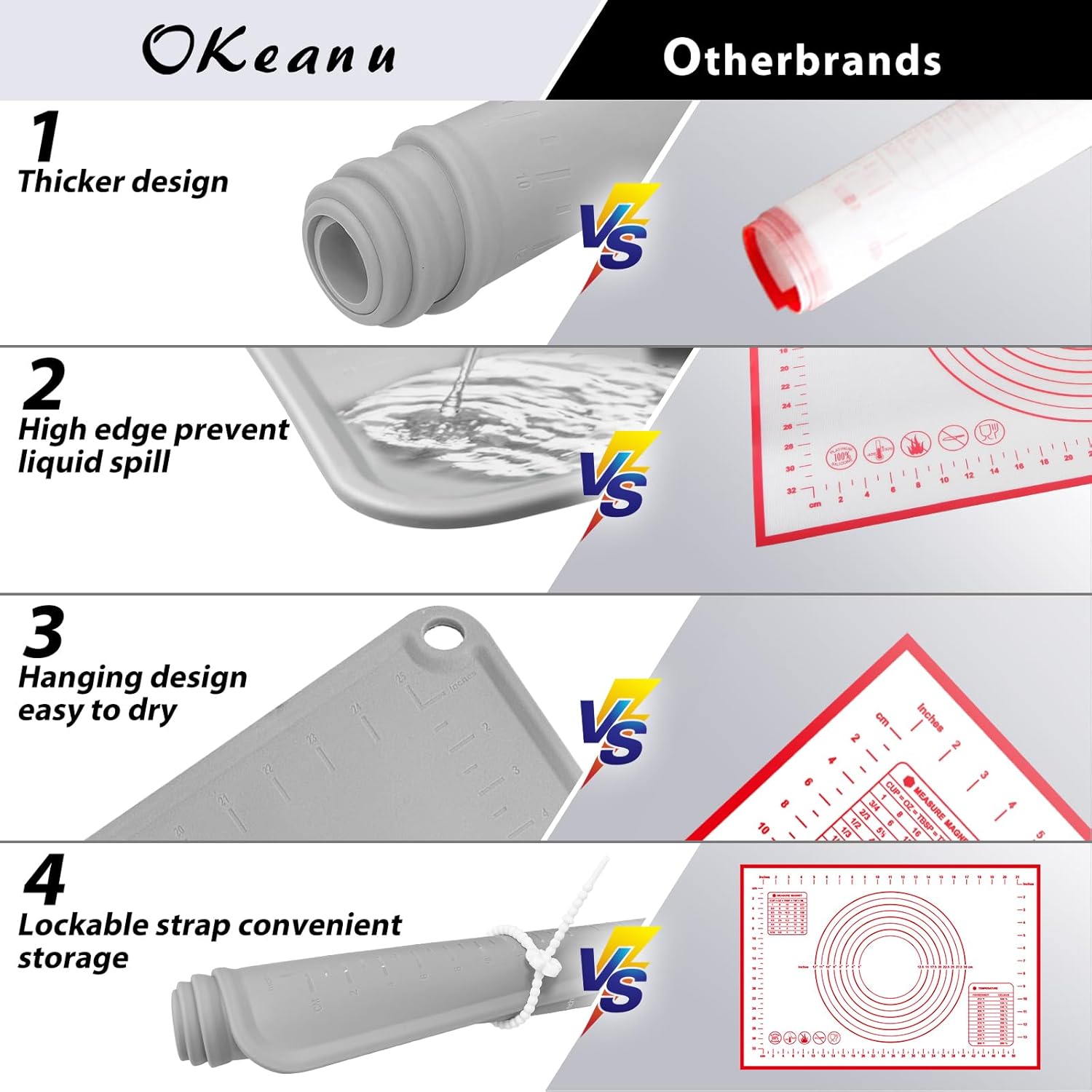 - DOUBLE THICKNESS & DURABLE MAT: The thickness silicone rolling mat is 1.5 mm and edge hightness is 4mm. The unique raised edge design can prevent the water from spilling out when you knead the dough, keep your desk clean.