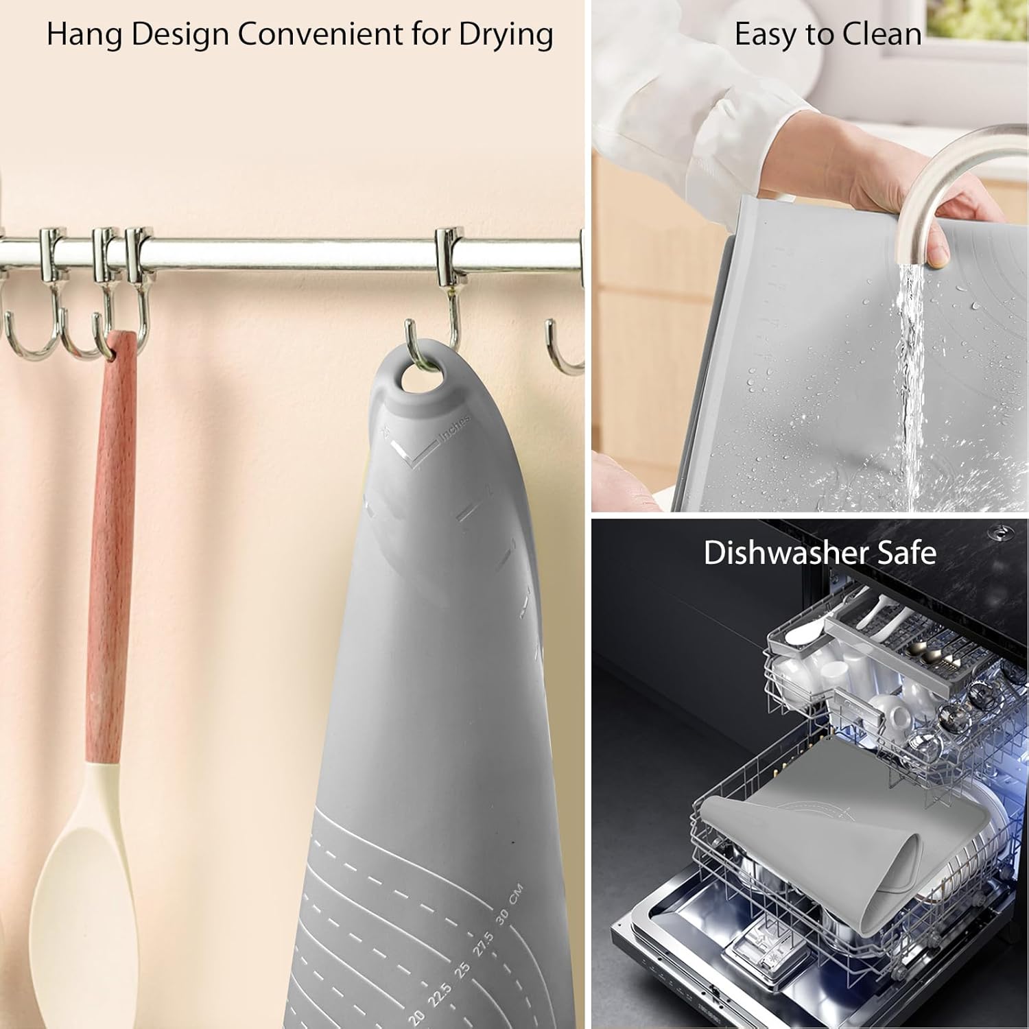 - EASY TO CLEAN AND STORAGE: Simply wash silicone pastry mat under warm soapy water and wipe clean with soft cloth. The surface will not leave residues. The side holes can be easily hung on the kitchen wall then dry itself. Every package has a cute strap, it can be rolled up or folded for easy storage and takes up very little space in drawers or cabinets.