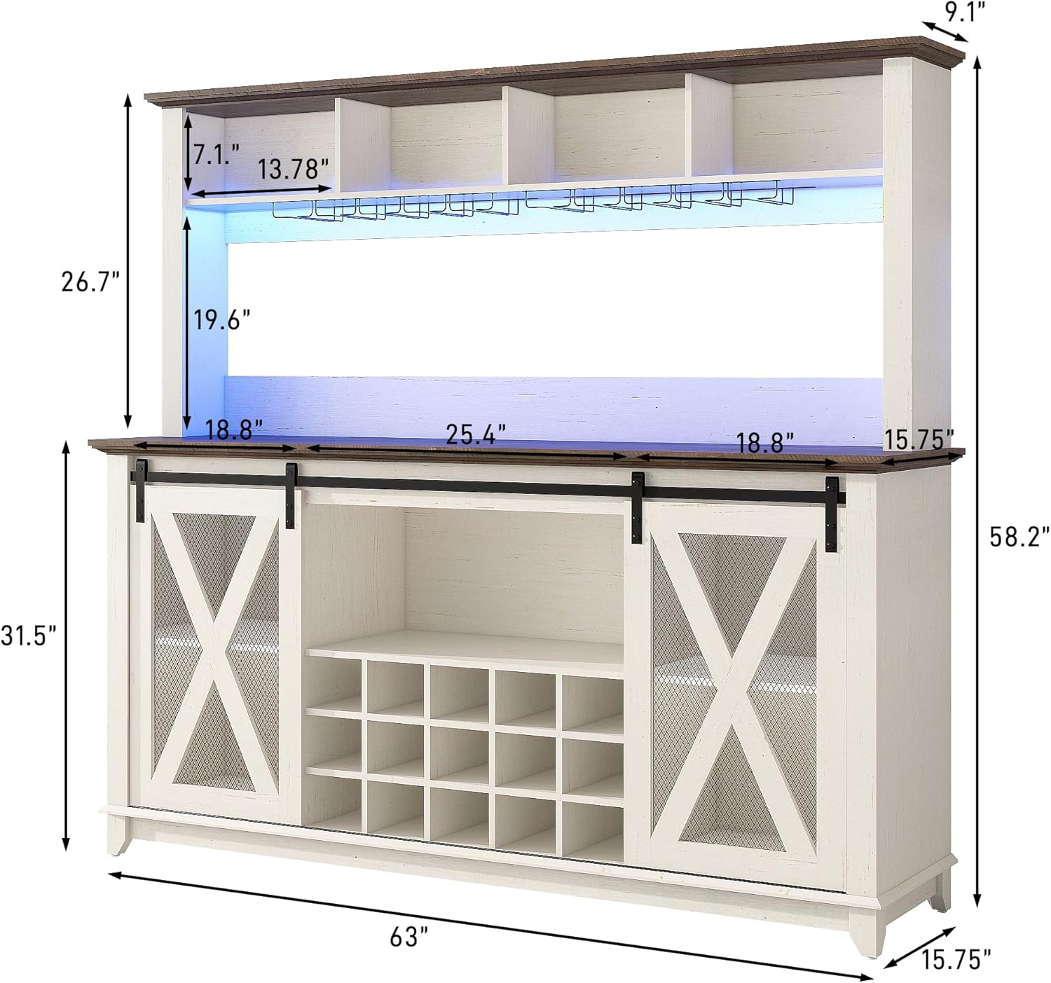 63"W Farmhouse Coffee Bar Cabinet with LED Light,Wine Bar Cabinet w/ 4 Tier Storage Hutch,Kitchen Buffet Cabinet w/Sliding Barn Door & 15 Wine and Glass Racks for Kitchen Dining Room(Antique White)
