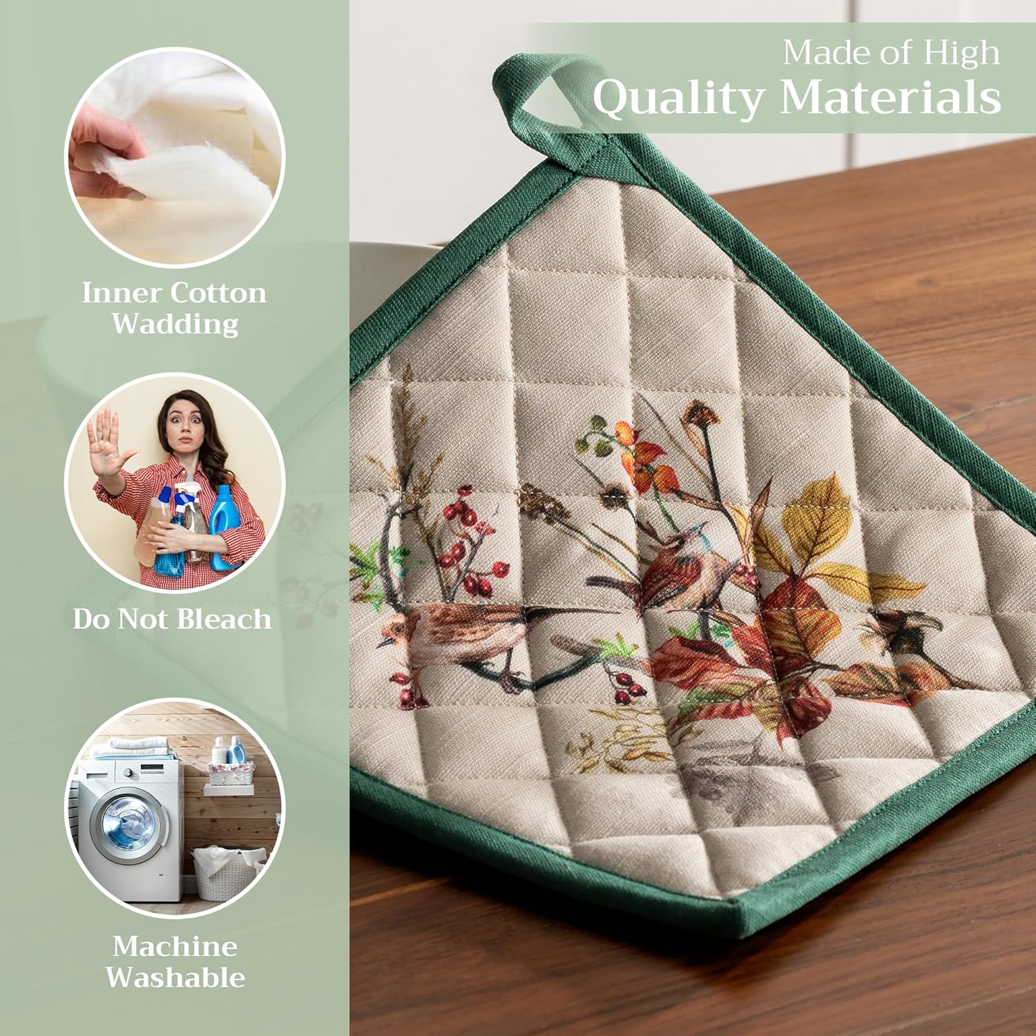 Maison d' Hermine Pot Holders Set 100% Cotton Heat Resistant Potholders 8" x 8" Hot Pads with Loop BBQ, Cooking, Baking, Grilling, Kitchen, Handling Hot Pans (Pack of 2, Recolte)
