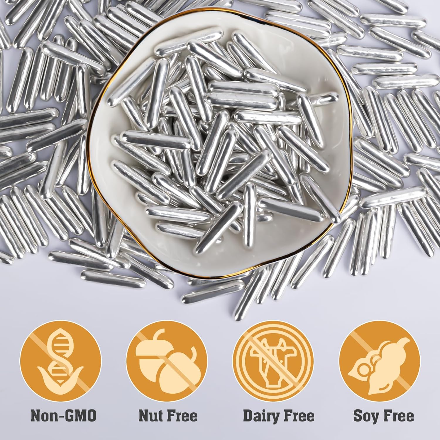 - 【Elegant Silver Rod Sprinkles for Versatile Use】:The bright silver color adds a beautiful, classy touch to desserts, making them look extra special. These silver candy rods are perfect for decorating cakes, cupcakes, cookies, giving them a shiny, eye-catching finish that’s sure to impress. Perfect for weddings, birthdays, anniversaries, Halloween, Christmas, Easter, Mother's Day, New Year’s and other special occasions.