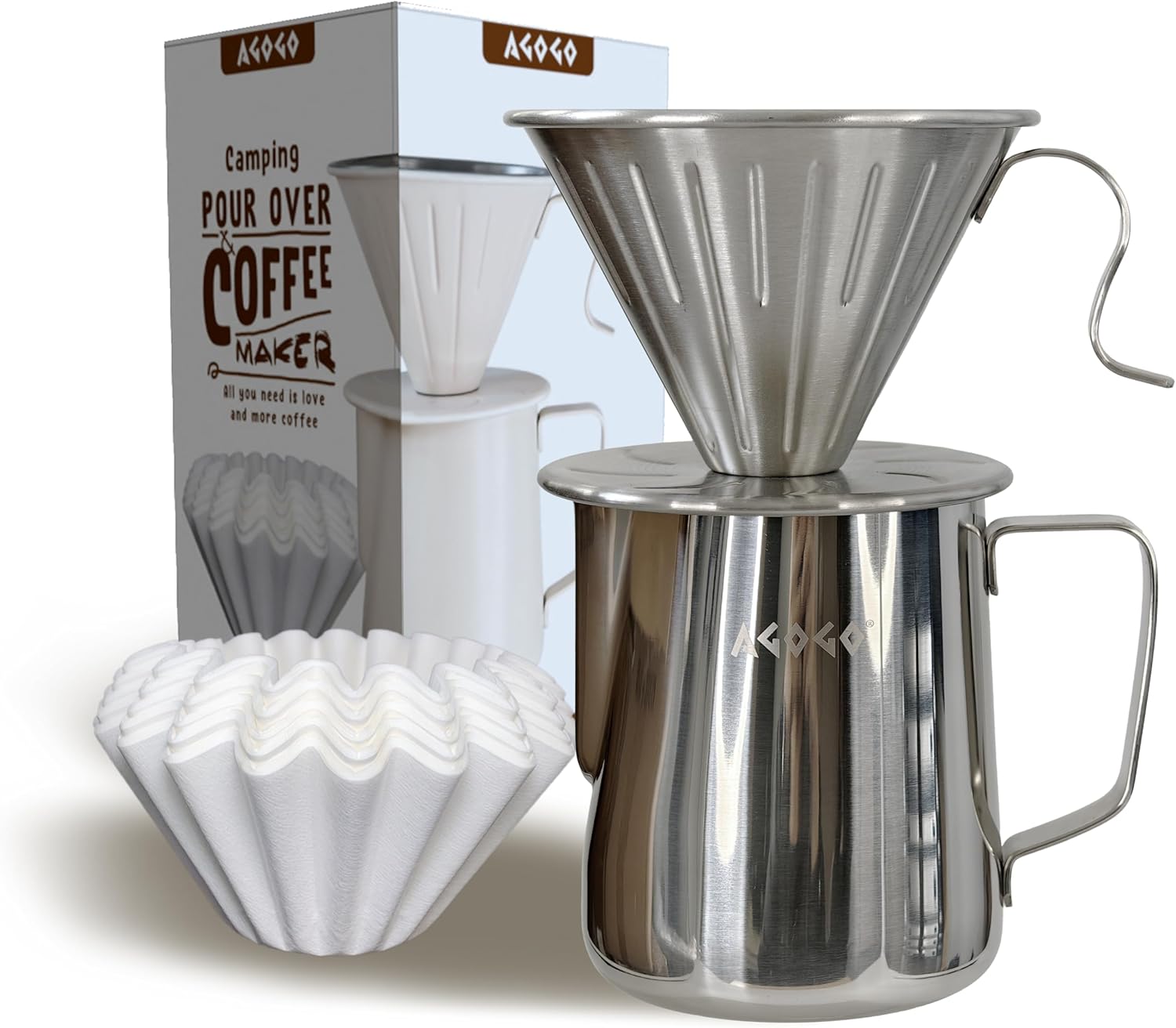 AGOGO Camping Pour Over Coffeemaker Set with Paper Filter Stainless Steel (Silvery, 600ml)