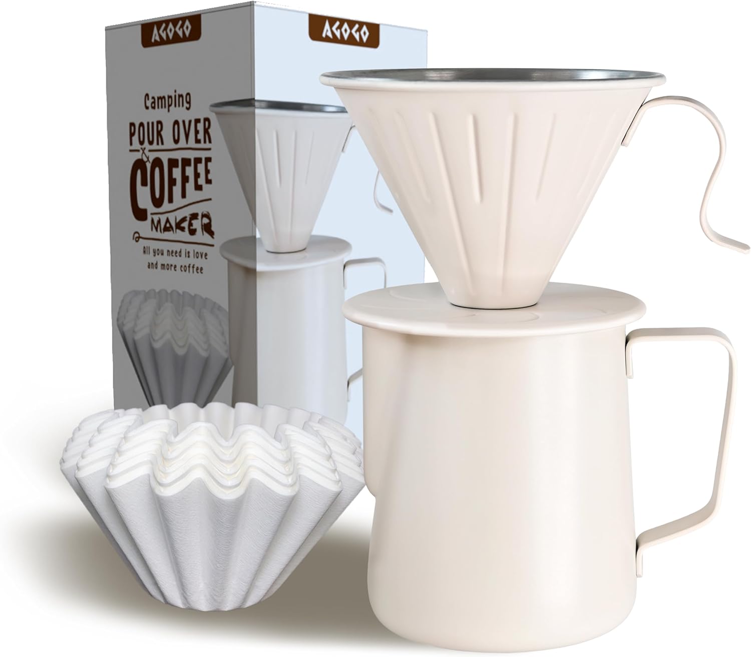 AGOGO Camping Pour Over Coffeemaker Set with Paper Filter Stainless Steel (Cream, 600ml)