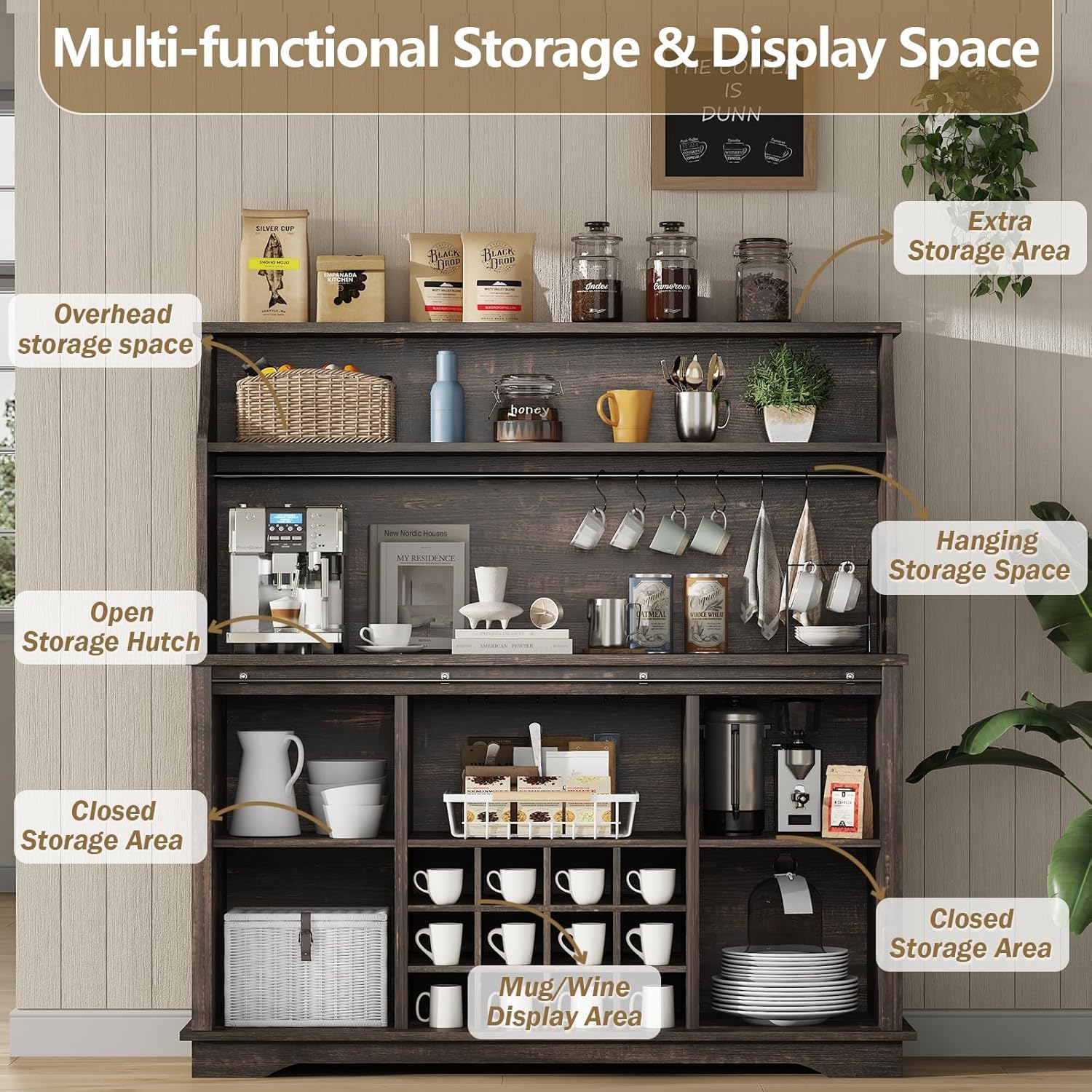 - [Storage Cabinet with Adjustable Shelves] This coffee bar has large bottom storage for coffee beans, blenders and utensils. Adjustable shelves fit items of various heights—ideal for kitchens pantry cabinet