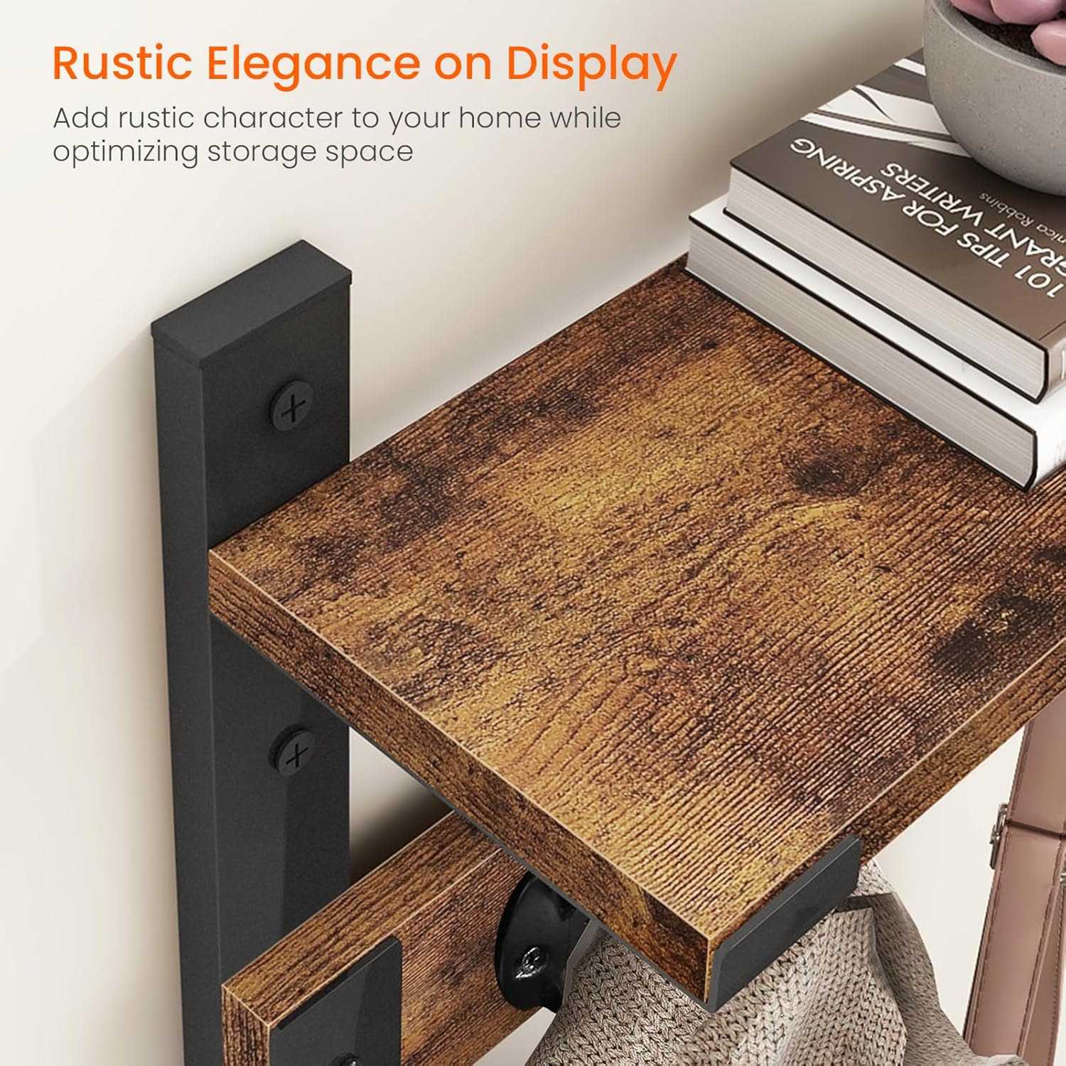 Homode Coat Rack Wall Mount with Shelf, Wood Wall Hooks with Shelf, Heavy Duty Entryway Shelf with Hooks with 4 Metal Hangers for Hanging Key Towel Hat Purse, Bathroom Bedroom, Rustic Brown Black