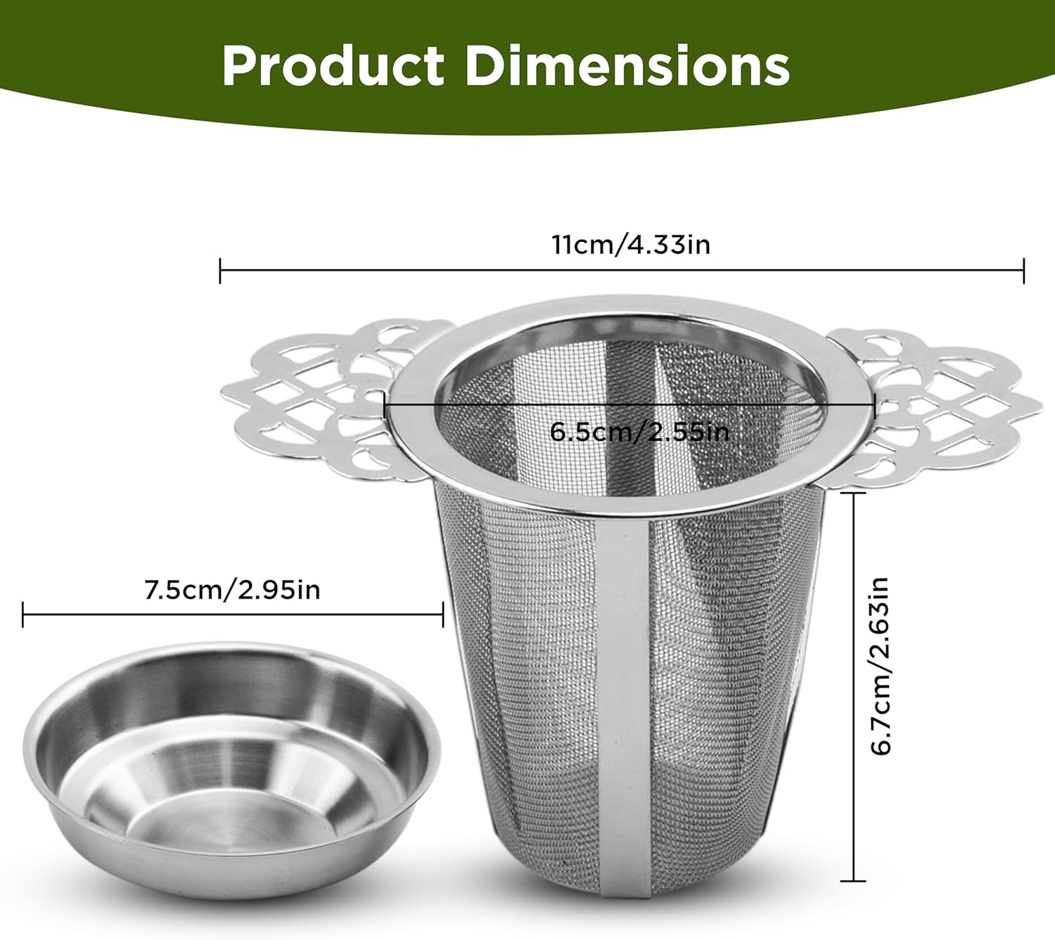 - PACKAGE DELIVERY: You will receive two units of tea filters and two small lids. It is a conical filter 11 cm (4.33 inches) wide at the top including the handles, the basket is 6.7cm high (2.63 inches) 6.5cm top diameter without handles (2.55inch) and the lid is 7.5cm (2.95 inches)