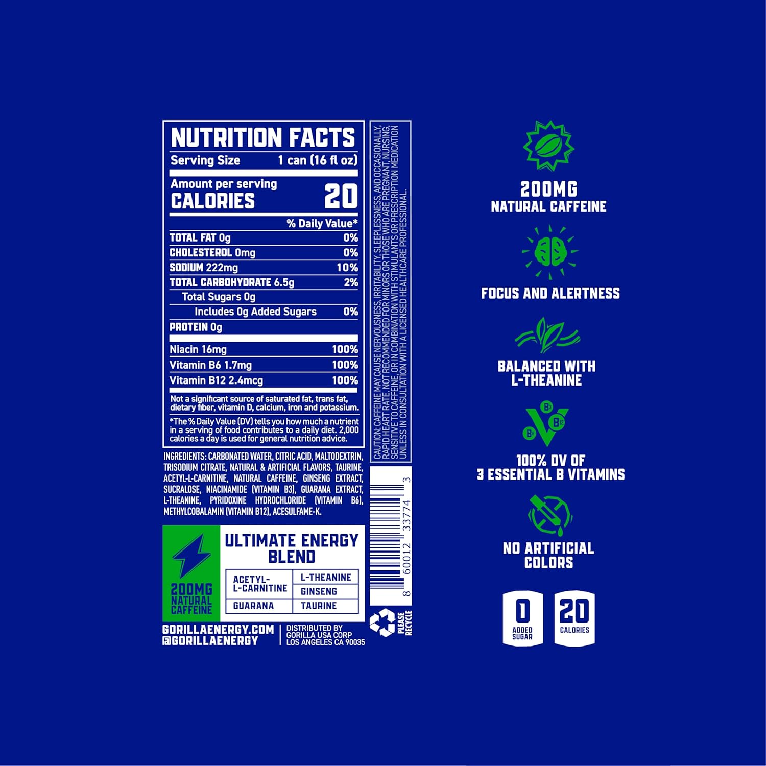 - GORILLA ULTIMATE PROPRIETARY ENERGY BLEND: Gorilla Energy features a proprietary mix of natural caffeine, taurine, Acetyl L-Carnitine, guarana, ginseng, L-theanine, and 100% daily value of 3 essential B vitamins.