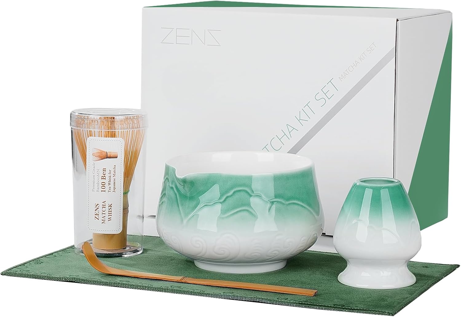 ZENS Matcha Whisk Set, Ceramic Matcha Set Includes Matcha Bowl, Matcha Whisk and Holder, Bamboo Scoop & Tea Towel - 5Pcs Matcha Kit for Matcha Ceremony, Blue