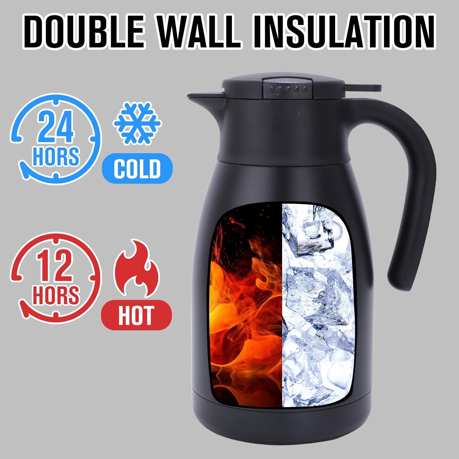 - USER FRIENDLY: GiNT 51oz thermal carafe features extra wide top opening, easy for cleaning and adding ice cubes; Simple-push button enables single-hand pouring without leaking, dripping or spilling; Ideal used for bedside, restaurant, office, party, camping, travel insulated coffee carafes.