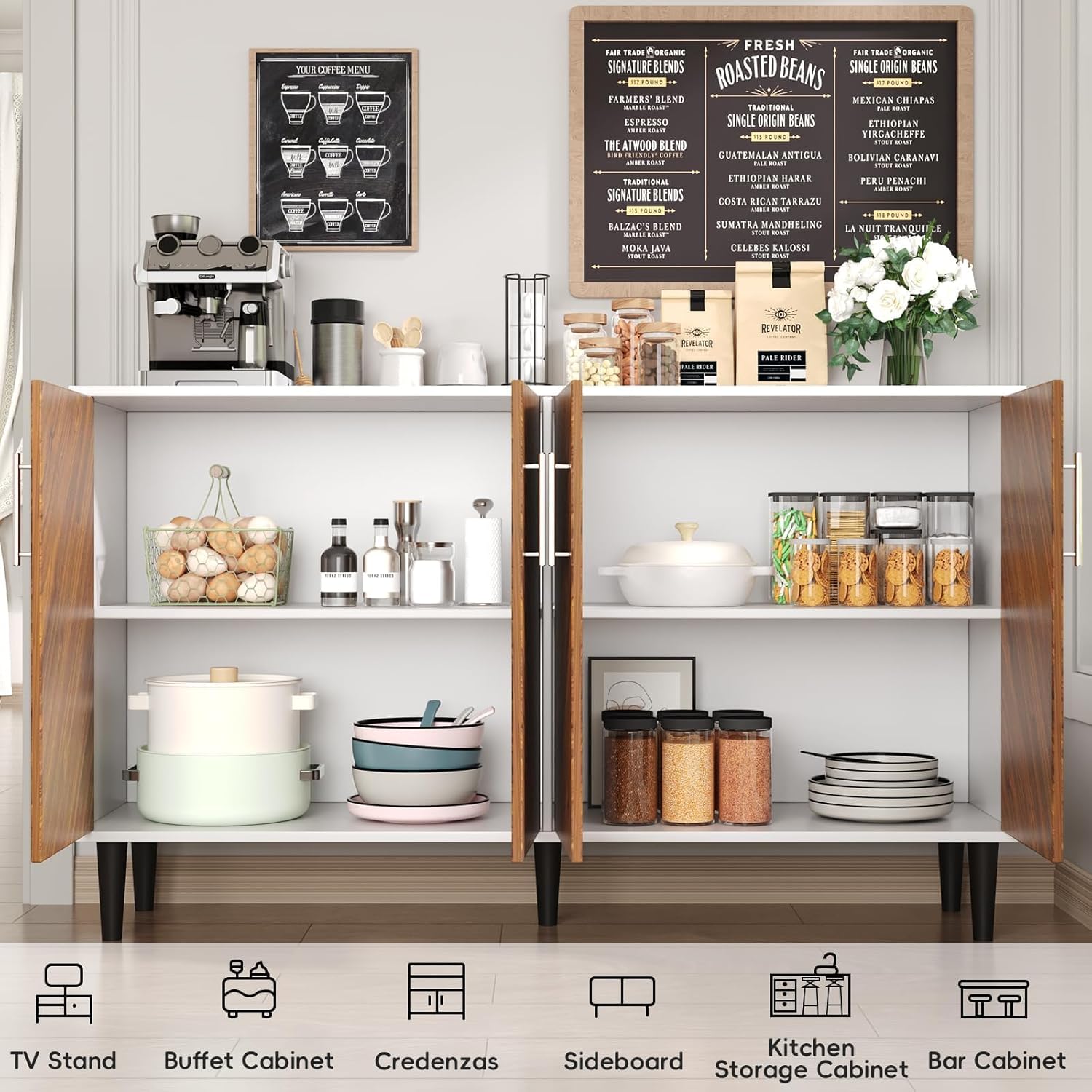 4 EVER WINNER Coffee Bar Cabinet with 4 Doors, Sideboard Buffet Cabinet with Storage, Walnut Buffet Cabinet with Storage with Adjustable Shelves for Kitchen,Living Room,White