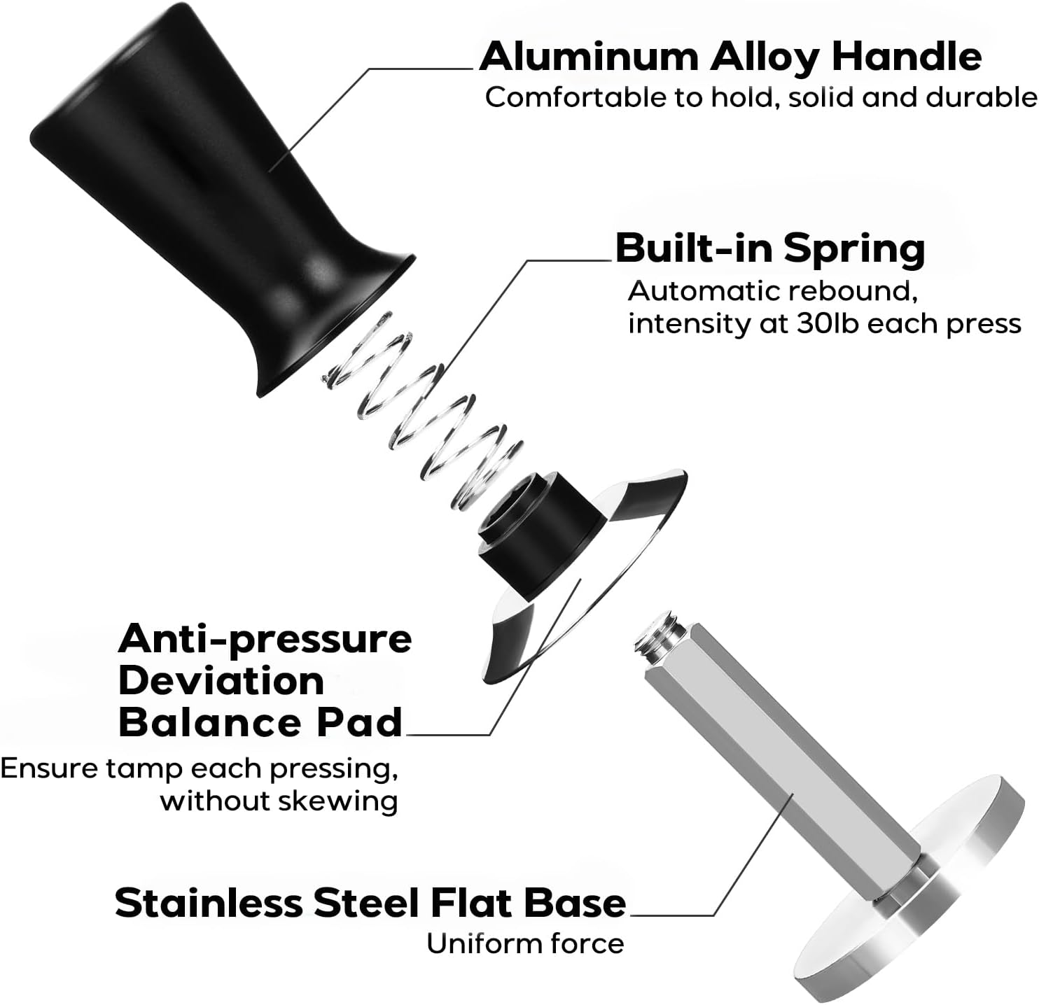 - Upgraded Espresso Tamper Tool: The built-in spring mechanism ensures a consistent 30lbs of tamping pressure, allowing for precise and effortless control. Extensive testing has shown that 30lbs of pressure delivers a more balanced and flavorful espresso. Whether you're a home barista or running a busy café, this tamper is an essential accessory for achieving the perfect shot every time.