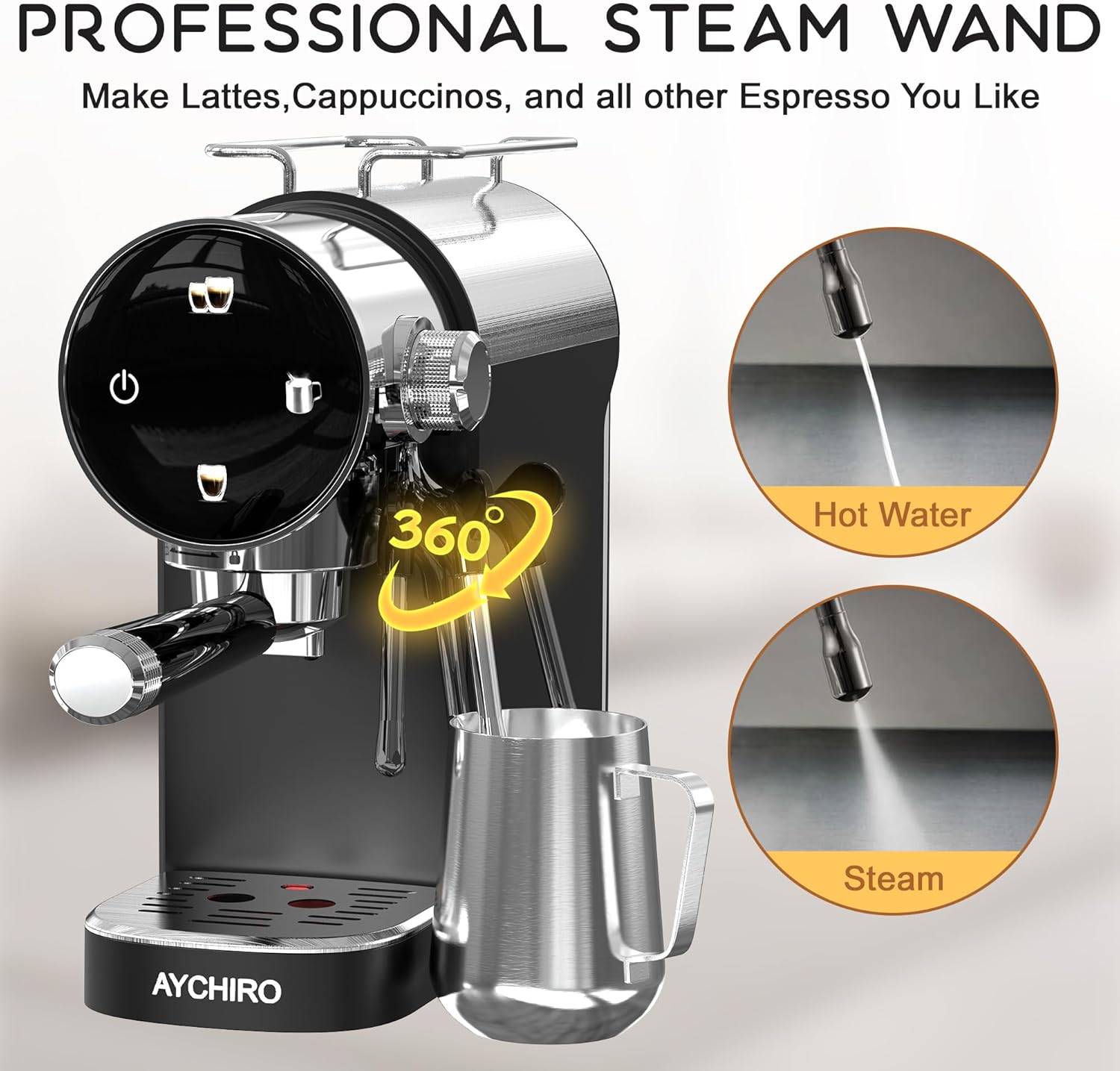 - 20 Bar Pressure System:AYCHIRO espresso maker gives you a great quality extraction, resulting in a richer aroma in your coffee. You can create a cappuccino, latte or flat white at home or in the office with our espresso machine.