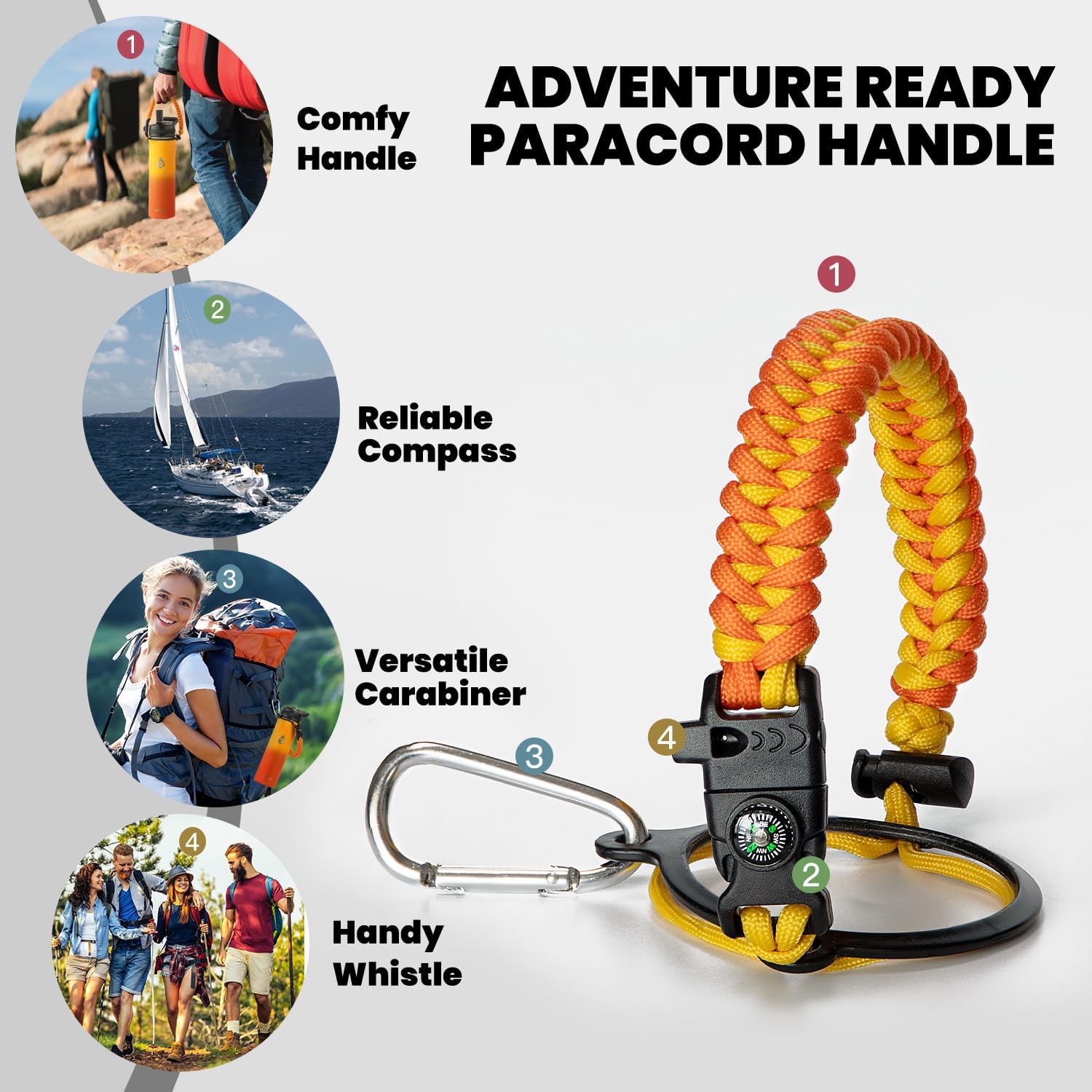 - Iconic Paracord Handle: This insulated water bottle comes with a beautiful hand knit nylon paracord in coordinated color with the water bottle. Configured with a compass and carabiner, this paracord handle is a must-have as a full functional camping / hiking flask
