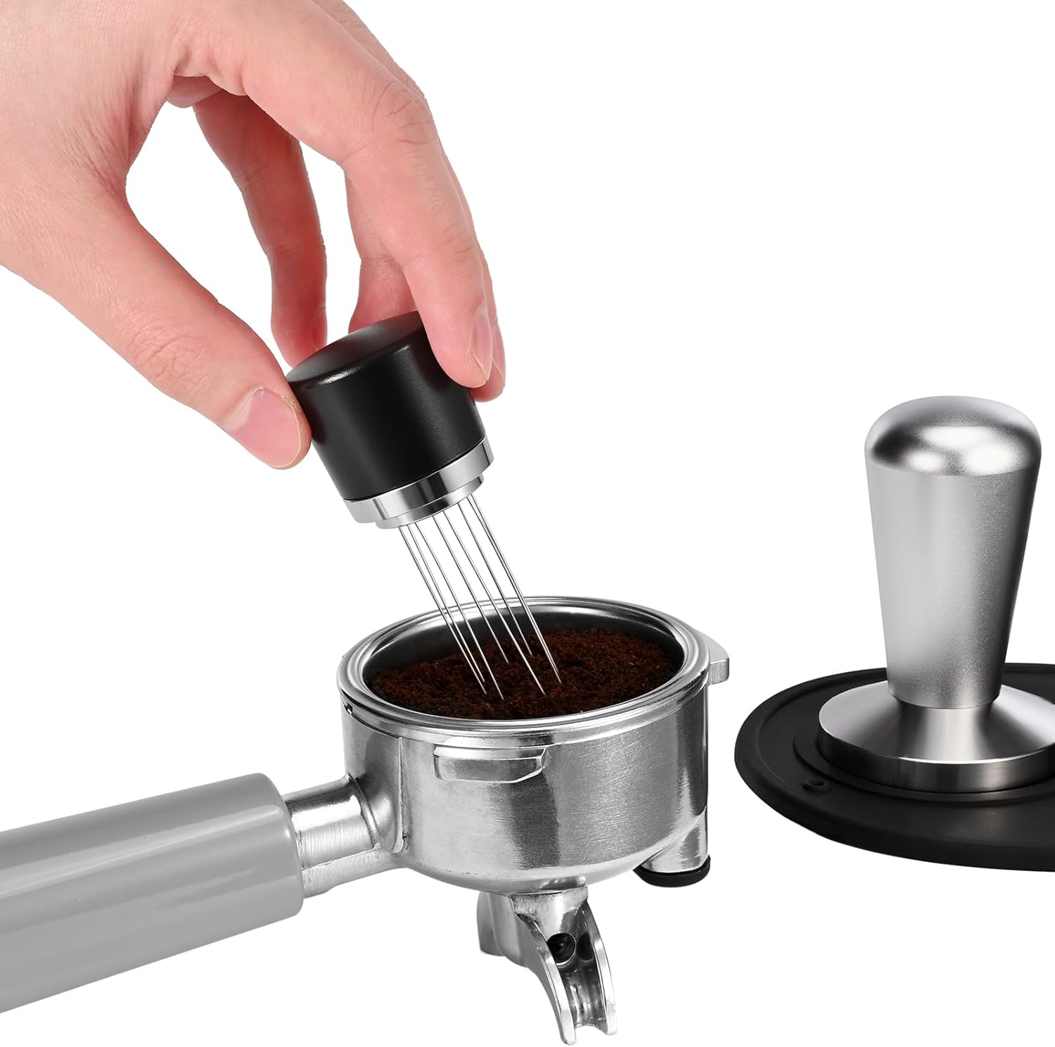 - 8 Detachable Needles – Ensure even distribution of powder before tamping. 0.4mm food safe stainless-steel needles. Dull instead of sharp needles avoid causing harm and scratches on portafilters.