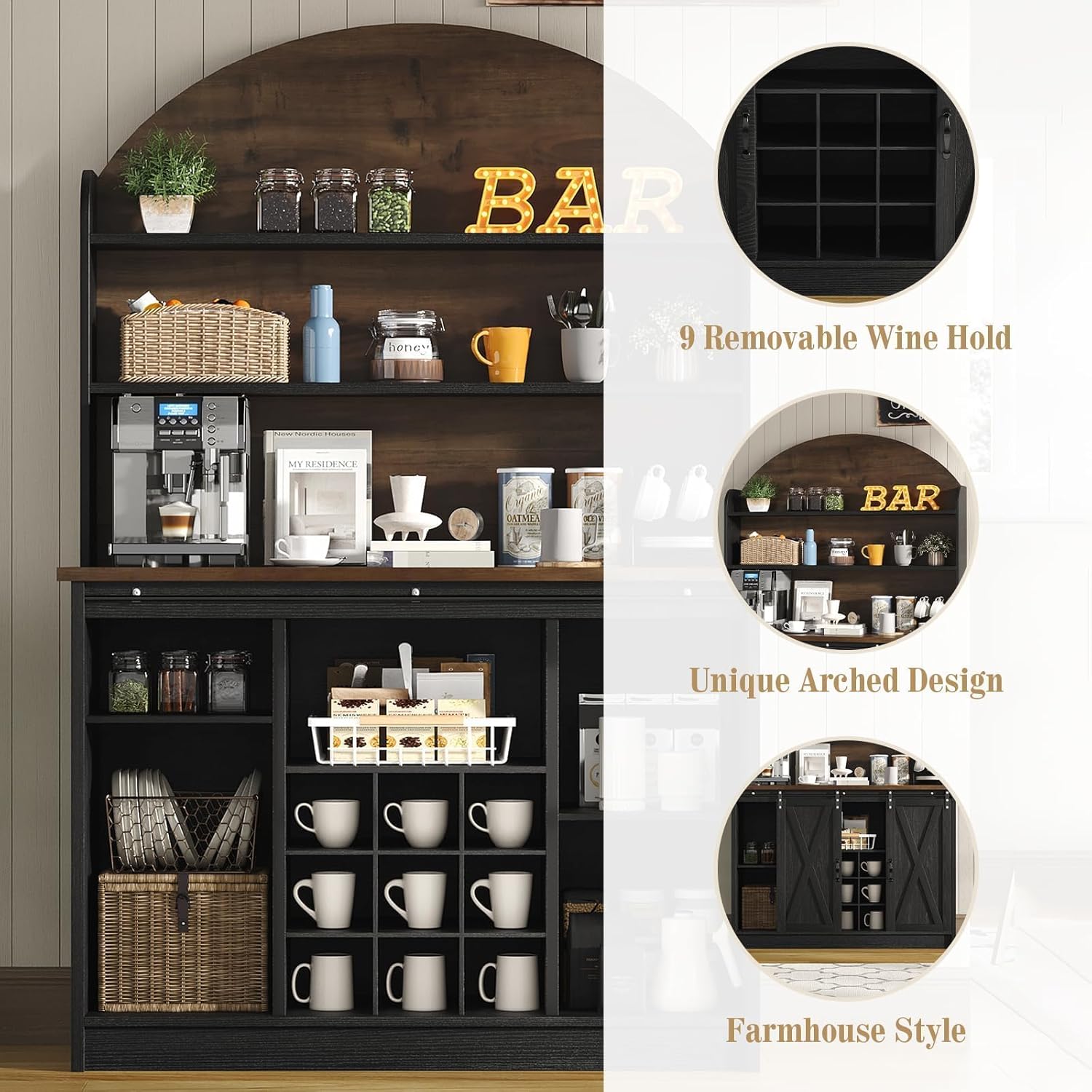 63" Farmhouse Coffee Bar Cabinet with Storage, Black Coffee Bar with Sliding Doors & Wine Racks, Hutch Cabinet with Storage, Adjustable Shelves, Wine Bar for Kitchen Living Dining Room, Black