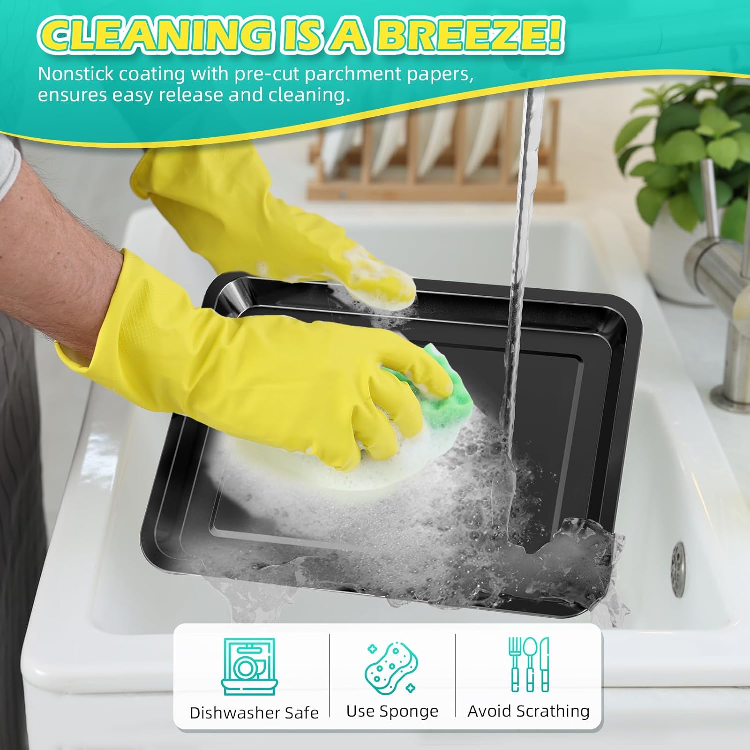 - 【Easy to Clean-up and Dishwasher-safe】OPENICE air fryer pan and basket is made of stainless steel with non-stick coating, reduces the risk of food-sticking, making cleanup after cooking a breeze. You can put the air fryer rack and tray set in dishwasher or hand wash with soap and water. With the included pacherment papers, the cleaning is even more easier, simply rinsing with water.