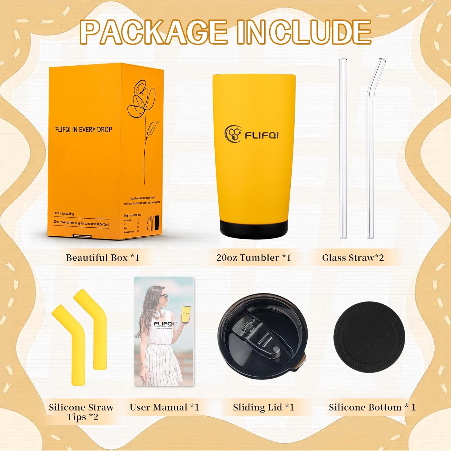 - GIFT BOX PACKING: Our tumbler comes in a beautiful gift box with 1*20oz tumbler,1* sliding lid, 2*straws, 2* eco-friendly reusable Silicone tips and 1* Silicone pad.The purpose of this gift is to spread love.