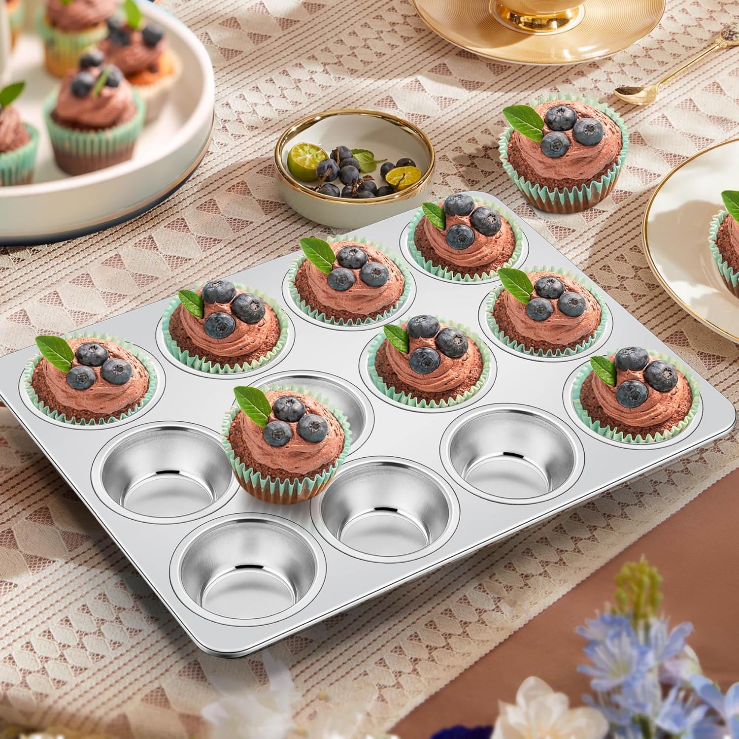 Homikit 3 Pack Muffin Pan, Stainless Steel Cupcake Tin with 12 Cups Regular Size, 13.8" x 10.4" Nonstick Metal Egg Bites Tray for Oven Baking, Non Toxic & Rust Free, Easy Release & Dishwasher Safe
