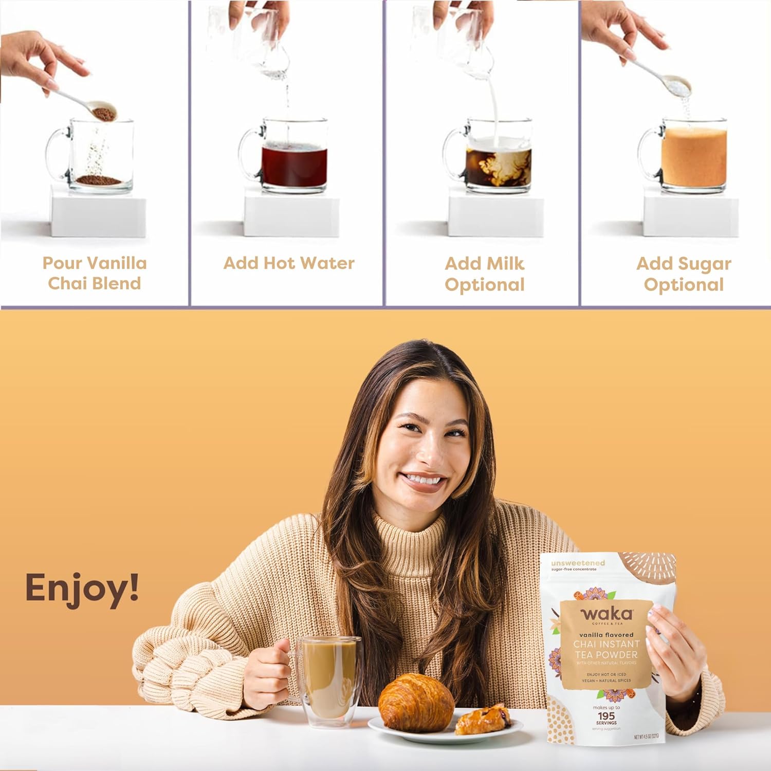- Dissolvable vanilla chai powder: a blend of pure tea leaves, natural vanilla flavor and real spices, free from artificial solvents, fillers, added sugar or preservatives. Simply mix 1/4 tsp of Waka's vanilla chai tea blend with hot water, add your favorite milk and sweetener, mix and enjoy. Make it hot or iced.