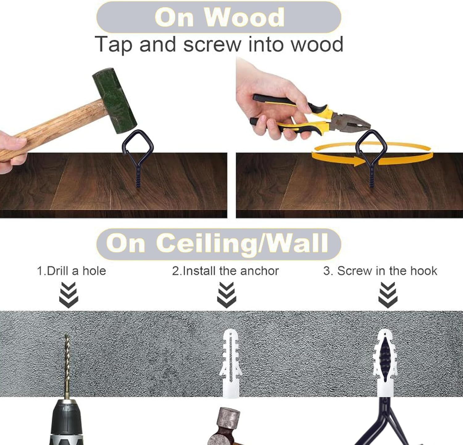 - 🔧【Easy Screw-In Installation】 Simply twist into wood, ceilings, beams, fences, or walls for instant hanging support. 2.36-inch length provides a firm hold.