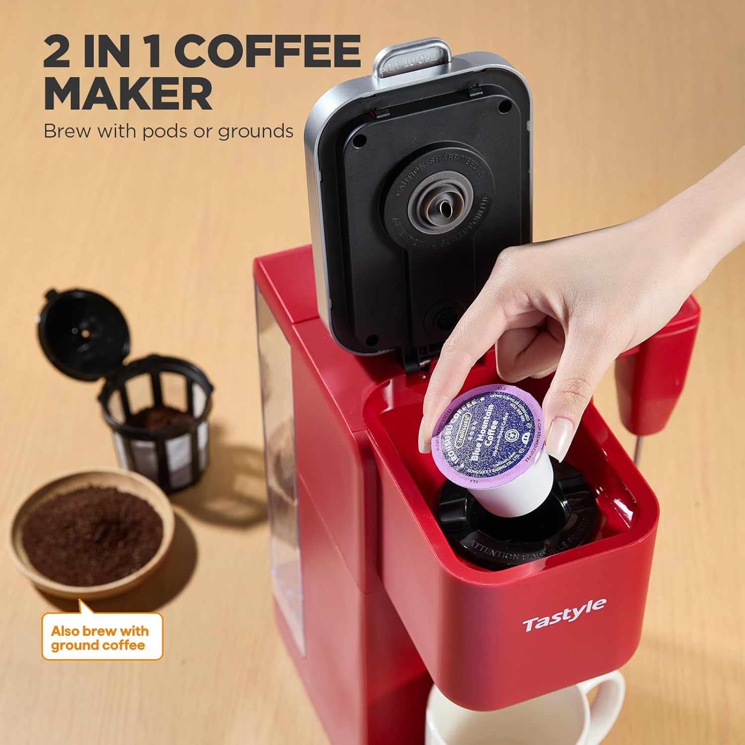 Single Serve Coffee Maker with Built-in Detachable Milk Frother, Iced and Hot Coffee Machine for K Cup & Grounds, 40oz Removable Water Reservoir, 6 Cup Sizes, Fits 7.3" Travel Mug, Red