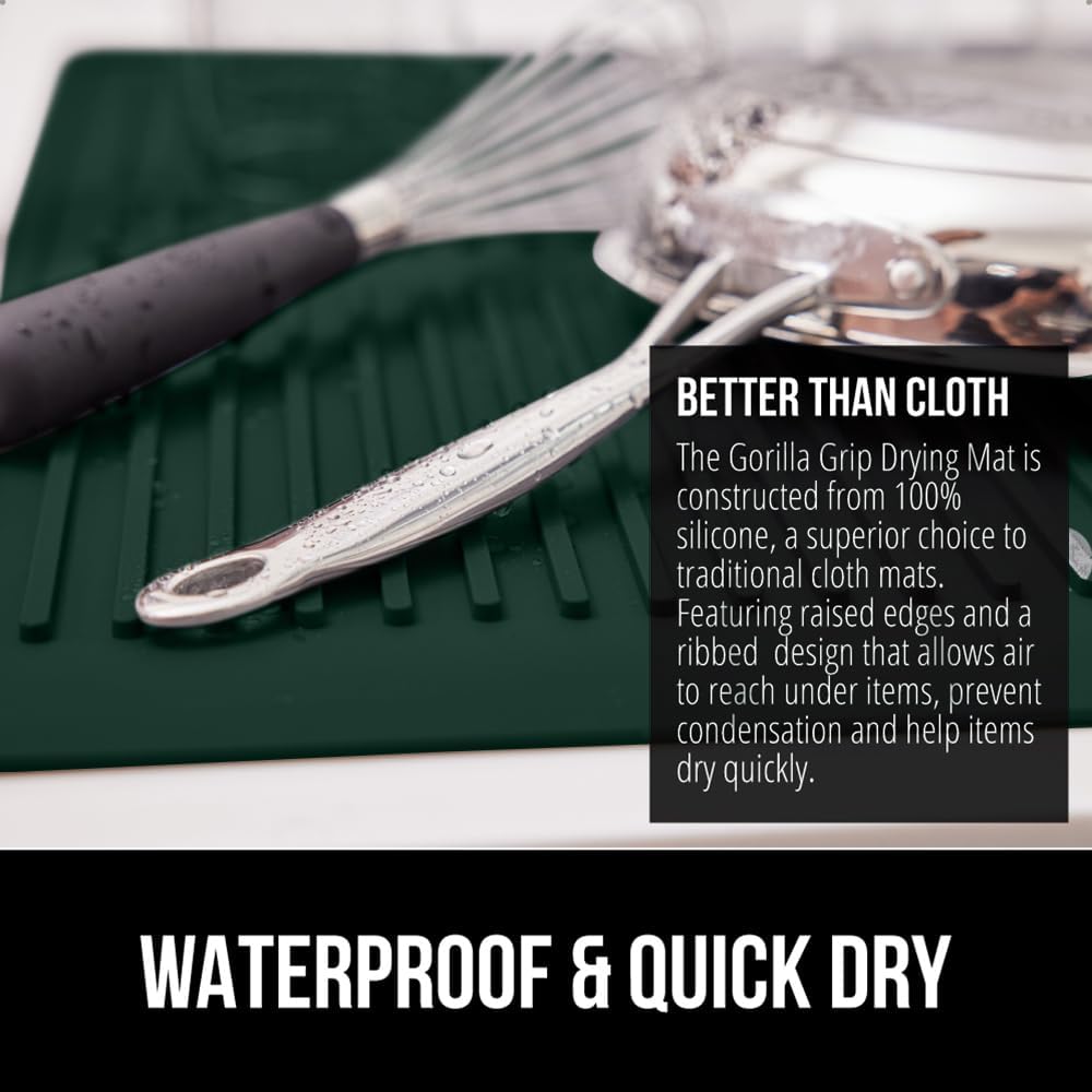 GORILLA GRIP 100% BPA-Free Silicone Dish Drying Mat for Kitchen Counter, Quick Dry, Water Catching Ribbed Design, Easy Clean Waterproof Sink Liner, Heat Resistant, Fits Under Rack, 16x12, Hunter Green