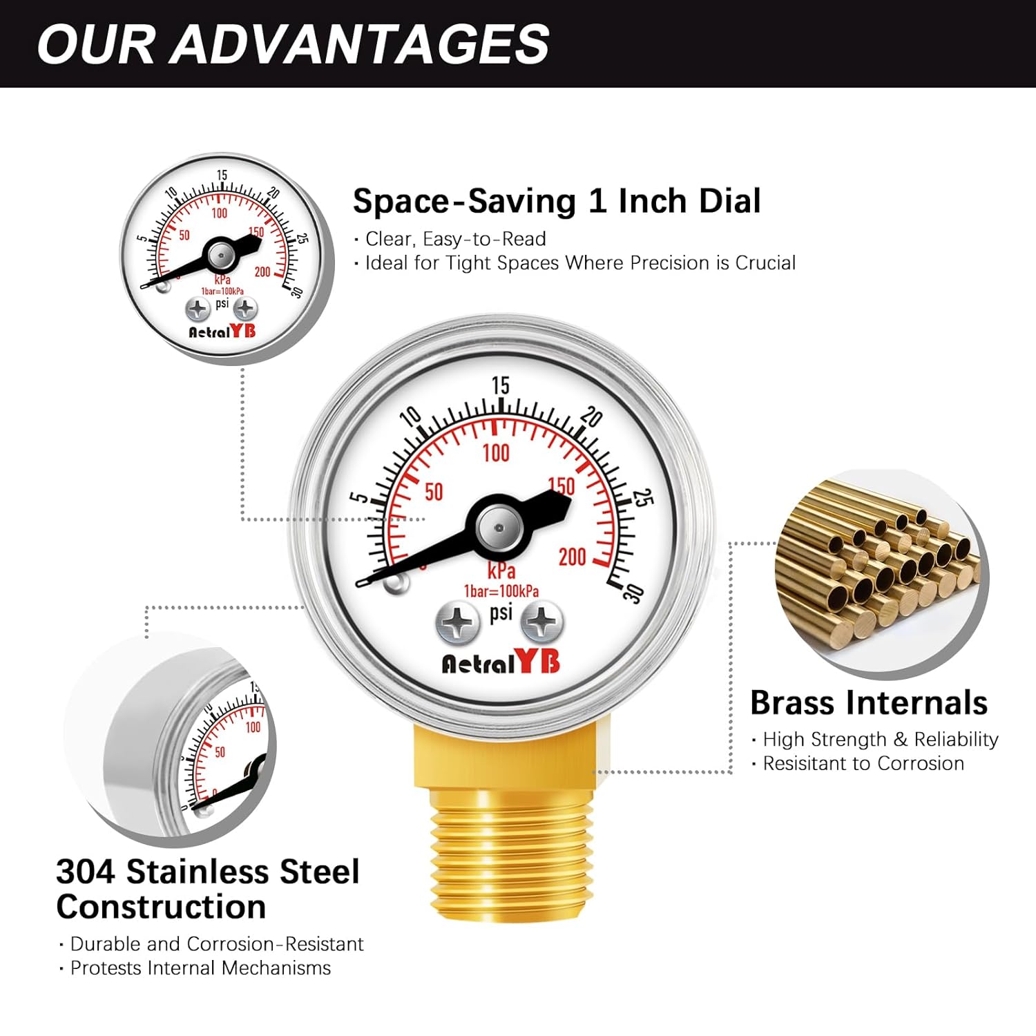 1-Inch Mini Pressure Gauge, 0-30 PSI / 0-200 kPa, Compact Dual-Scale Gauge, 1/8” NPT Bottom Mount, Stainless Steel Case for Coffee Machines, Airbrush Systems, Sprayers, and Pneumatic Tools