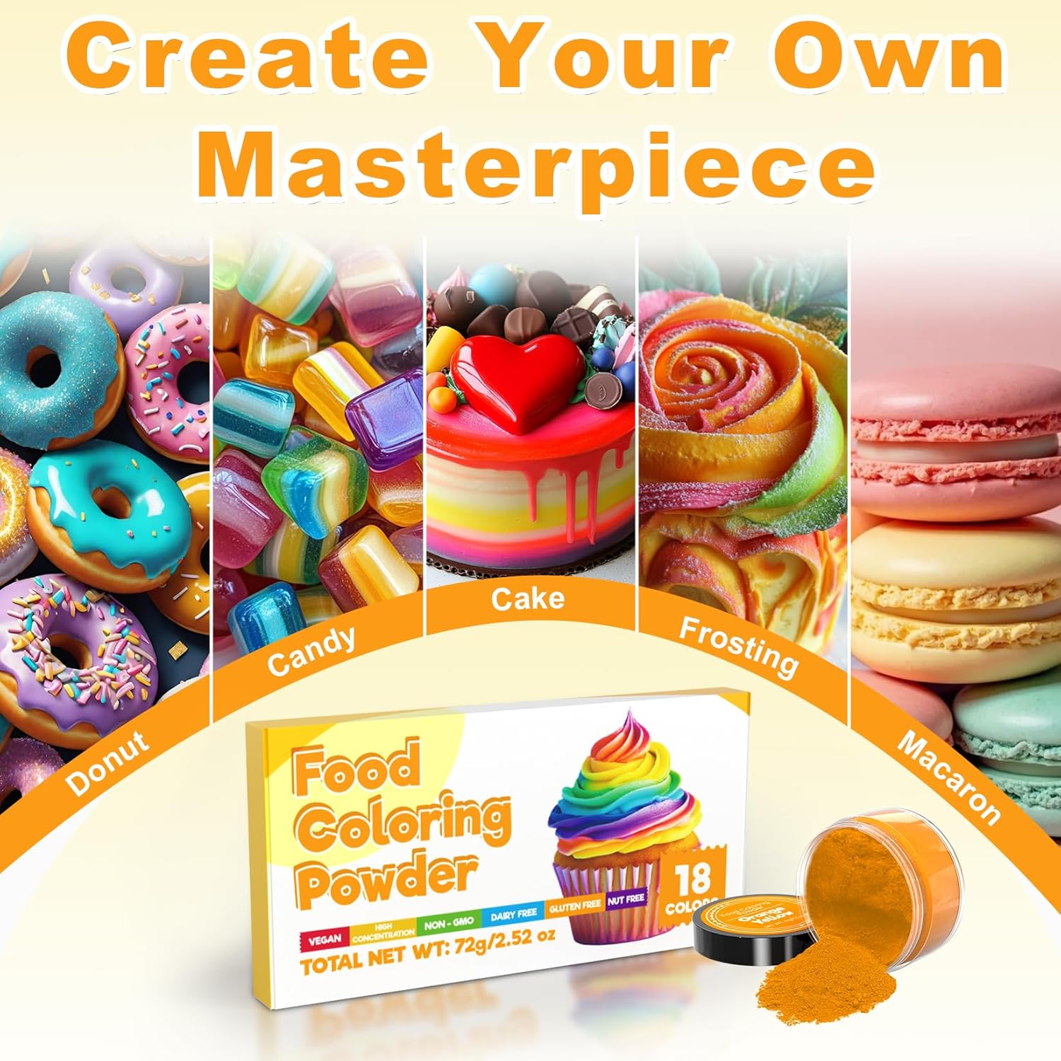 - Vibrant and Long-Lasting: The food coloring with a highly concentrated formula ensures intense, bold hues with minimal powder (just a pinch needed). Colors stay vivid even after baking, freezing, or heating, unlike liquid/gel alternatives that fade or evaporate. Perfect for achieving professional-quality results in cakes, frosting, and crafts.