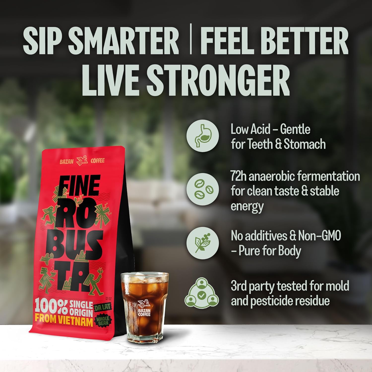 BAZAN COFFEE Fine Robusta Vietnam, Notes of Durian, Honey & Caramel, Organic Whole Bean, Medium Roast, Naturally Fermented 72H Anaerobic, 12oz