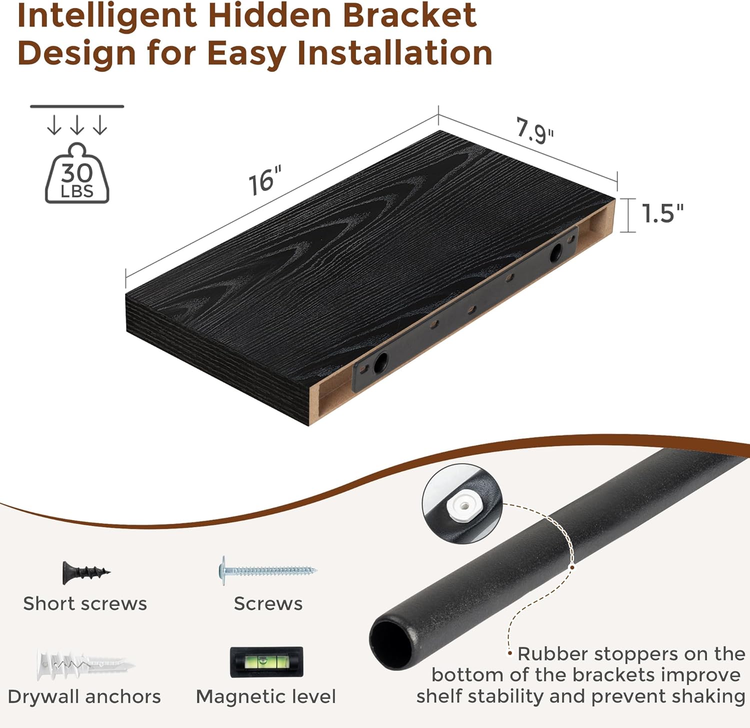 Heimlove 16 Inch Floating Shelves for Wall Black Shelves Set of 2,Wall Mounted Rustic Wood 8 Inch Deep Floating Shelf with Invisible Brackets for Bedroom Kitchen Living Room